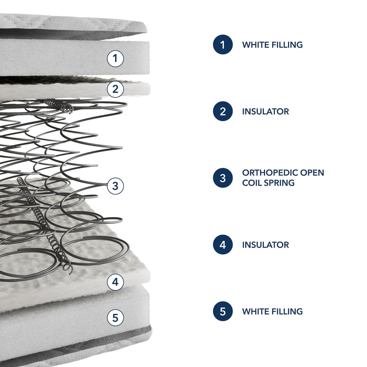 * 12.5g open coil bonell spring* Butterfly edge to edge support to provide extra stability* Dual sided use to prolong mattress life* Recycled polyester fillings* Quilted box border* No handles and no vents* Hand tufted* Very firm support The Fogarty Firm Open Coil Mattress is the epitome of stability and firm support. Crafted with a 12.5g open coil Bonnell spring and butterfly edge-to-edge support, it provides the stability you crave for a night of undisturbed slumber. With dual-sided use to prolong mattress life, recycled polyester fillings, and a quilted box border, this mattress exemplifies sophistication. Say goodbye to handles and vents and hello to a very firm support that'll leave you feeling refreshed and revitalised each morning. Need to throw out your old mattress first? View our information on [mattress recycling and collections](https://www. dunelm. com/info/about/mattress-and-furniture-recycling).