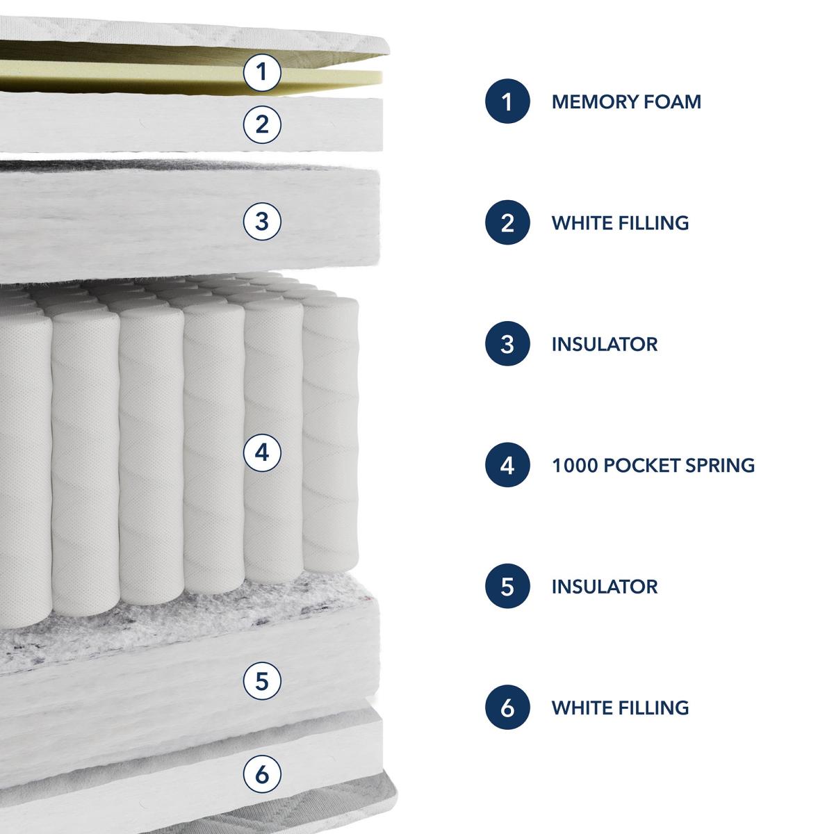 * 1000 pocket springs which respond individually to movement and prevent any sleep disturbances* Single sided mattress* Hand tufted* Recycled polyester fillings* Memory layer which moulds around the body and provides additional comfort* Quilted box border* No handles and no vents* Hand tufted* Medium support* Spring insulator pad Elevate your sleep with the Fogarty Just Right Memory Foam 1000 Pocket Sprung Mattress. Featuring 1000 pocket springs that respond individually to movement, this single-sided marvel is hand-tufted for extra support. The recycled polyester fillings and memory layer provide exceptional comfort, while the quilted box border adds a touch of sophistication. Enjoy medium support without handles and vents, with the added benefit of a spring insulator pad for an undisturbed night's sleep. Need to throw out your old mattress first? View our information on [mattress recycling and collections](https://www. dunelm. com/info/about/mattress-and-furniture-recycling).