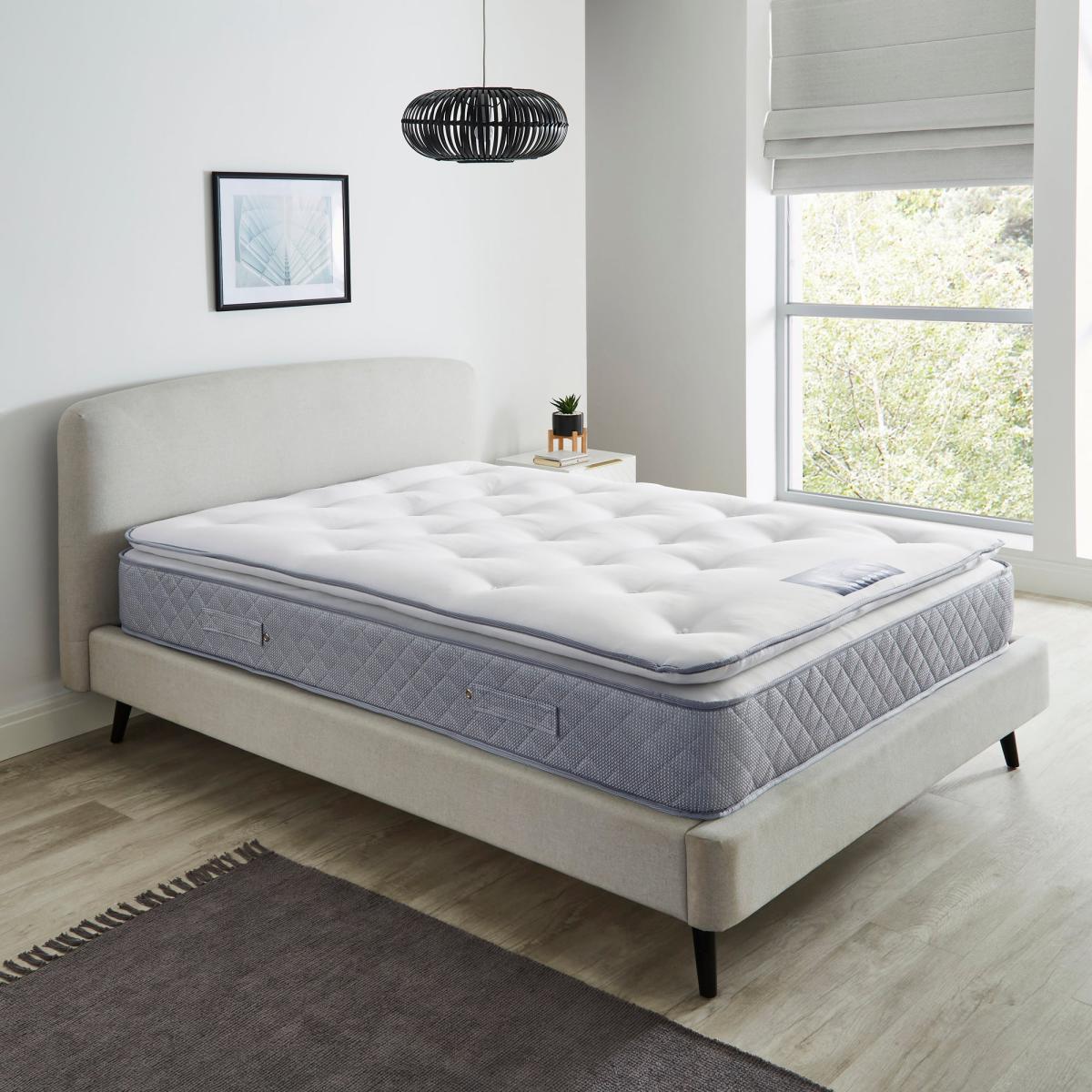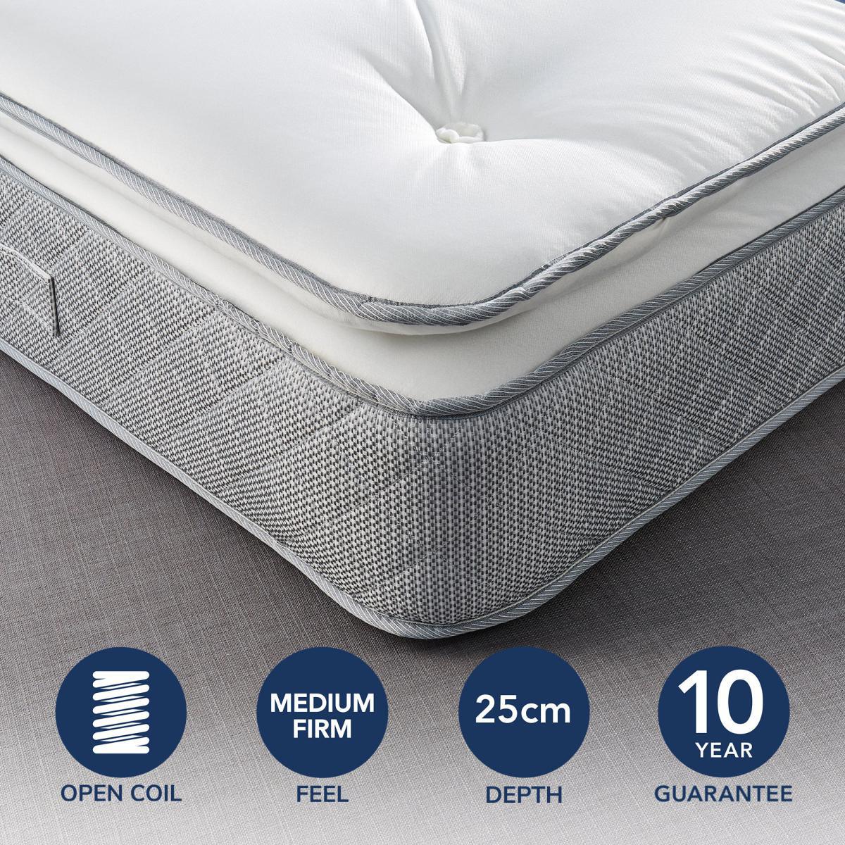 Get your beauty sleep with our Fogarty pillow top open coil mattress. Providing consistent support, this mattress has a traditional open coil design that moves with your body whilst you sleep. Offering medium-firm support with orthopaedic properties, this mattress aids natural spine alignment and support making it perfect for back and front sleepers. It is complete with a pillow top for additional cushioning for a perfectly restful night’s sleep. The springs are encased with our Eco-Flex filling to provide added comfort by providing an extra padded layer between you and the springs. Eco-Flex is a material constructed from repurposed & recycled clothing and textile waste making this mattress kinder no the planet. All of these features sit inside a wire frame to help the mattress hold its shape and to provide edge-to-edge support. Finished with a micro quilted boarder with 2 handles for easy moving, this mattress features 4 air vents to allow for pressure & temperature regulation and is complete with a hypoallergenic fabric cover to help reduce any allergy triggers. Due to its pillow top, this mattress should not be flipped. Instead, you should regularly turn your mattress to help prolong its life and redistribute the support. This product is supplied by NBF Approved Members, who have been independently audited against a set of strict criteria and standards set by the National Bed Federation. Need to throw out your old mattress first? View our information on. Mattress recycling and collections. * For health and hygiene reasons, we are unable to offer refunds or exchanges on Mattresses unless they are returned unused and in their original packaging. For more information please see our Easy Returns section.