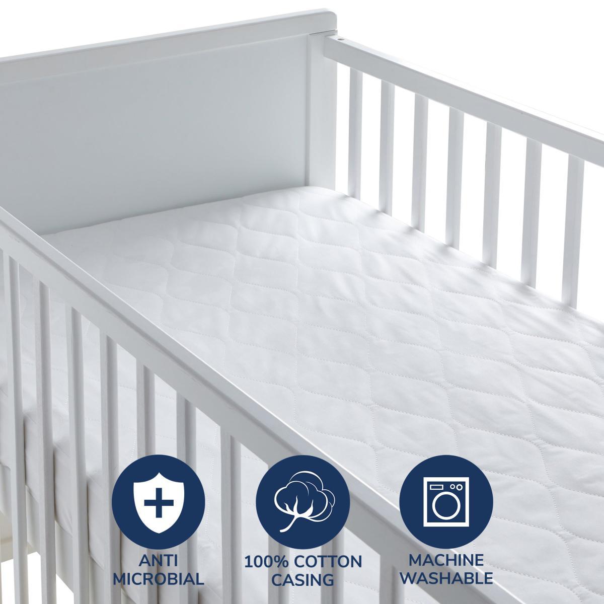 Finished with a Micro-Fresh treatment that inhibits the growth of bacteria for at least 50 washes, helping to keep your little one's bedding fresher for longer. Fully waterproof and machine washable up to 60 degrees centigrade. This mattress protector has a luxuriously soft 233 thread count cotton cover for ultimate comfort and features a knitted polyester skirt. Contains recycled fibre.