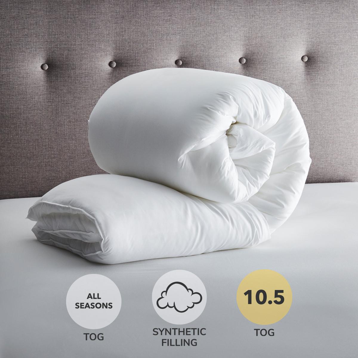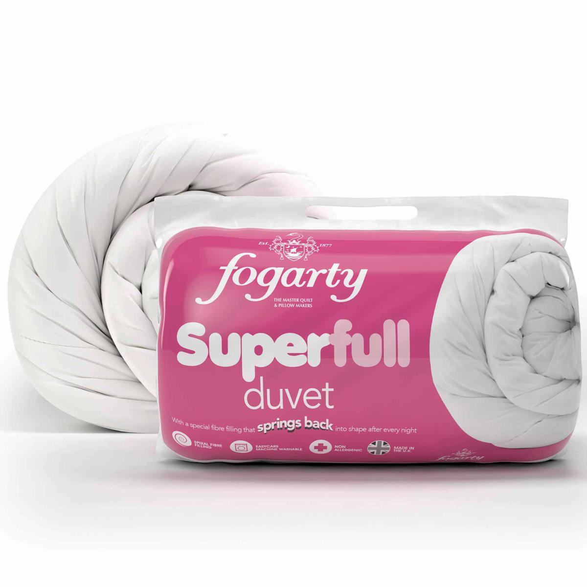 This year round 10. 5 tog duvet from the specialists at Fogarty is equipped with a super full spiral filling which springs back into life after every night. With a luxuriously soft microfibre cover for extra comfort, this duvet was manufactured in the UK and is available in a selection of sizes. Contains a blend of recycled fibre.