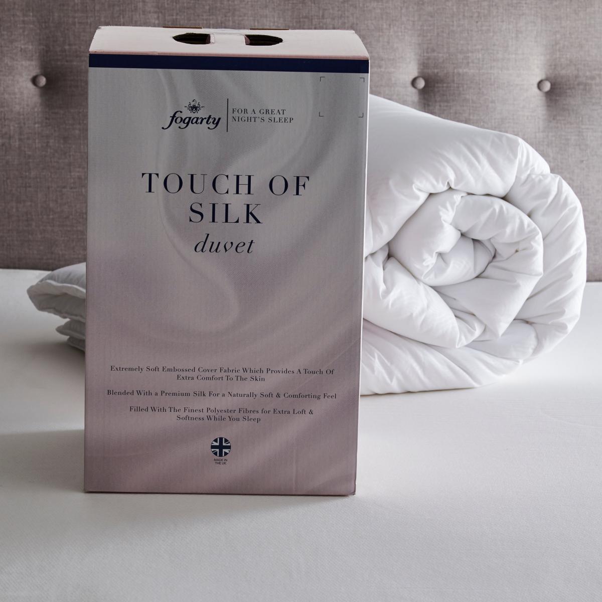 Crafted with a 100% polyester cover with quality embossed detail, the Fogarty Touch of Silk duvet is filled with a polyester and silk filling for a super cosy feel while you sleep. This expertly designed 7. 5 tog duvet is ideal for the spring/summer months and provides the perfect warmth without the weight. Machine washable for easy care and made in the UK. Contains a blend of recycled fibre.