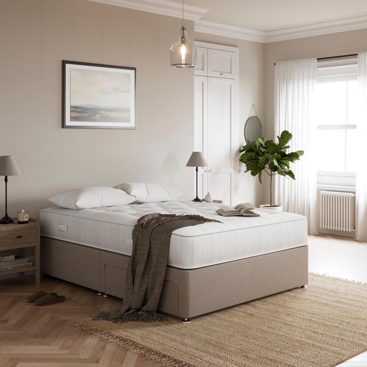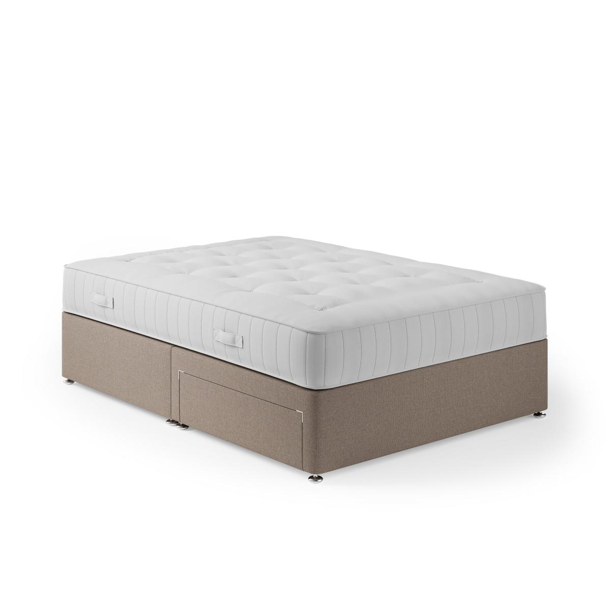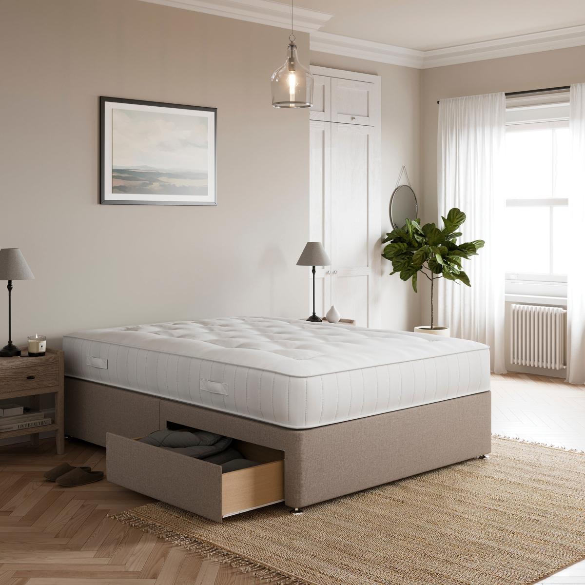 * Mattress and Divan Base* 1000 Pocket Sprung* Pillow top - added comfort* Medium Support - ideal for front & back sleepers* Quilted border* Platform top base* 2 Drawers at foot end This exceptional divan set features a platform top base designed to provide extra support and stability, complemented by a non-slip material to keep the mattress securely in place. Crafted from high-quality softwood and hardwood, this durable set includes a medium support mattress equipped with 1000 pocket springs for individualised comfort and support. Practical handles and vents on the mattress make it easy to move and maintain, while its dual-sided design helps to prolong its life. Available in a variety of colours to seamlessly match any bedroom decor, the set also includes a discreet 2-drawer storage area, perfect for organising essentials. Please note that the headboard is not included, allowing you to customise your bed to your personal taste.