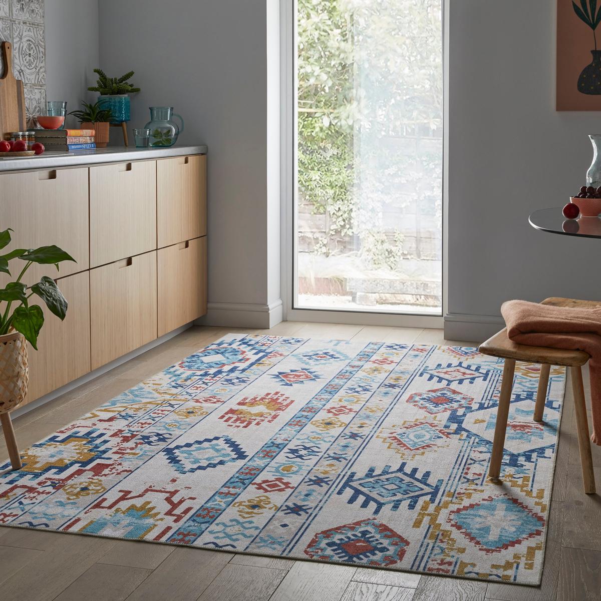Introducing the Fold Ramona Washable Rug, a unique, machine washable and foldable rug in a globally inspired design in a classic colourway. This piece is a versatile option for versatile homes and lives, packed in its own easy to handle tote bag and a 100% polyester pile, the low-profile composition is perfect for sitting under furniture or in high-traffic areas. The Fold Ramona Washable Rug is great in every room in the house, even kitchens and bathrooms because of its machine washable qualities. To wash at home simply pop in the washing machine at 30 degrees with no detergent, and then line dry. Make sure to check machine drum size so you don't overfill. Care guidelines: Safe for use on a heated floor. Use a suction type vacuum - rotating brushes may damage this rug. Regularly turn to ensure even wear. An anti-slip mat will help prevent slipping. Blot spills immediately with a clean, dry white cloth. Do not rub. Do not place this rug near an open fire. Please do not leave children or infants unattended.
