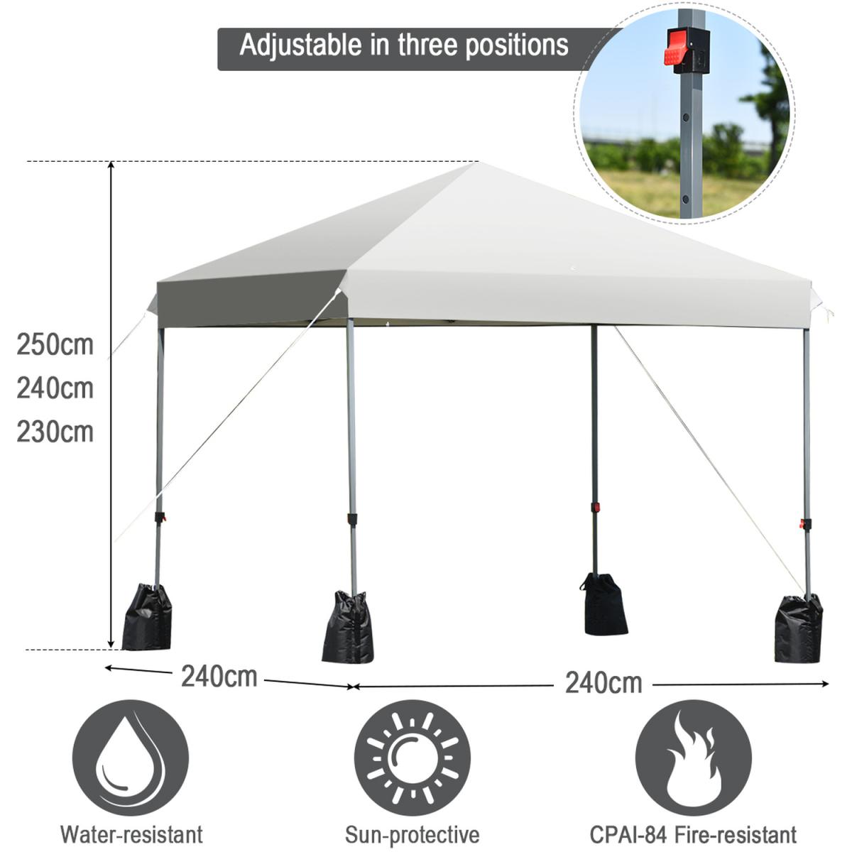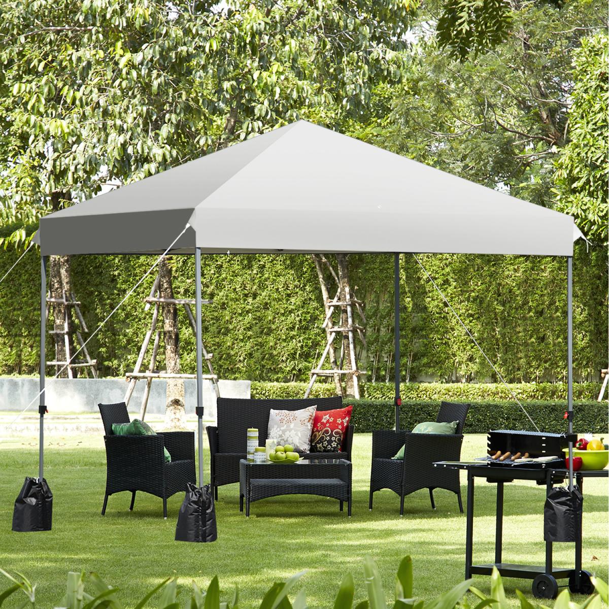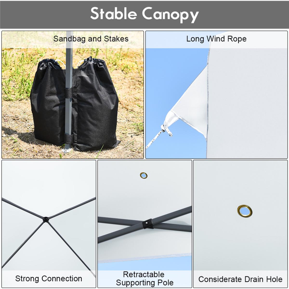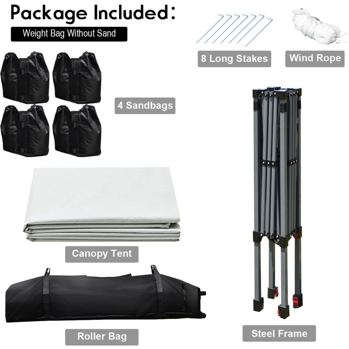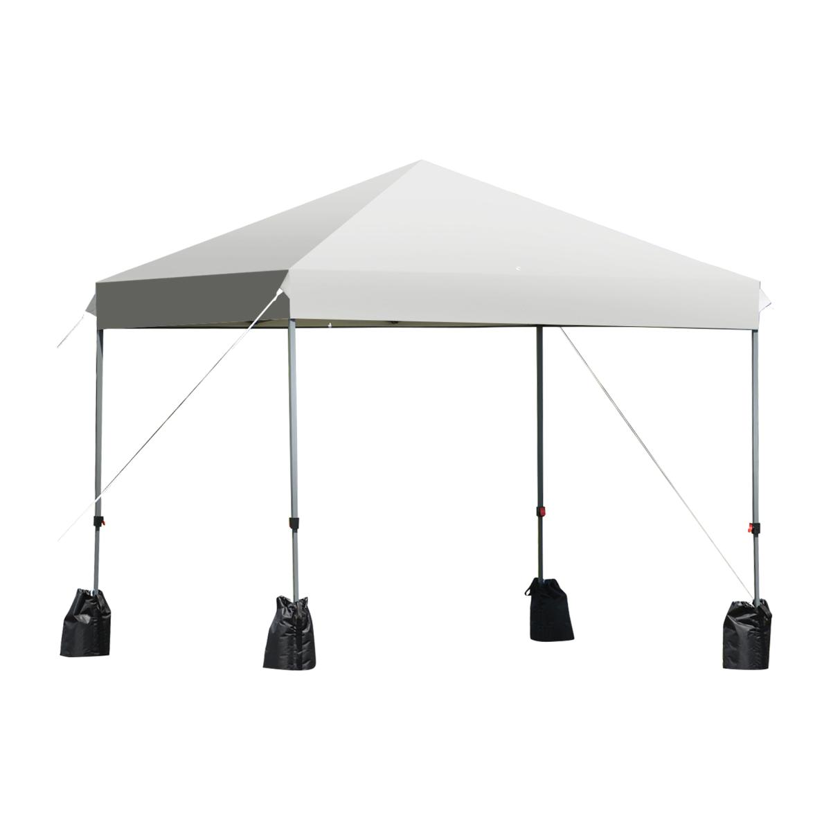 Are you finding a foldable canopy to provide shelter for some outdoor activities?Our folding tent which can be conveniently stored in a portable bag to carry and perfect for many outdoor activities like parties, camping, flea markets etc.Constructed of powder-coated solid steel, the frame of the tent is rust-resistant and can provide long time service. And the height of canopy can be adjusted in three positions to meet your different needs. The wind ropes, stakes and sandbags which come with tent can also add stability of tent. Whether the weather is rain or shine, this outdoor shelter is sure to make your outdoor gathering pleasant. Under the canopy, there is enough space for you to place furniture like deck chair, table and loveseat to enjoy leisure time with your family or friends.