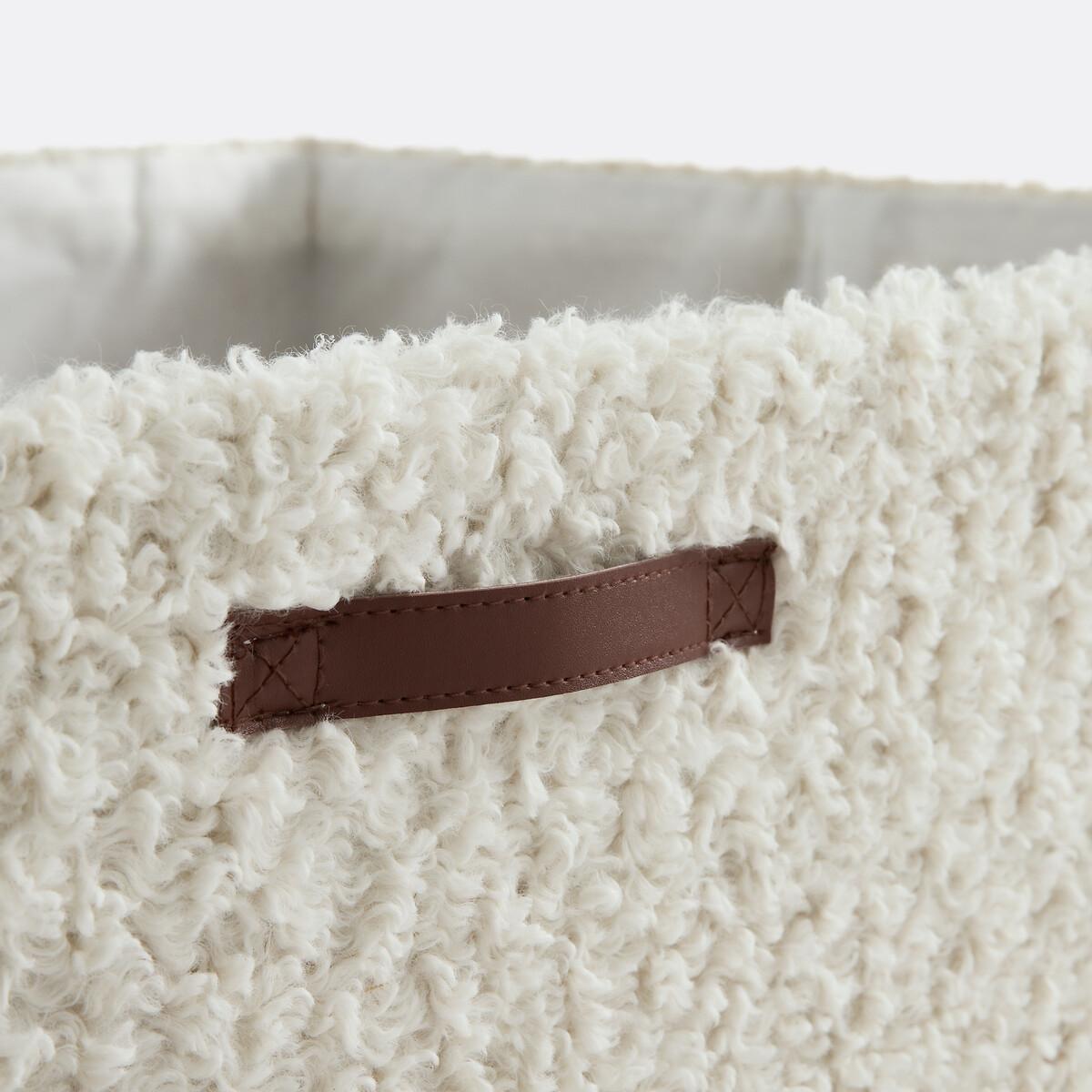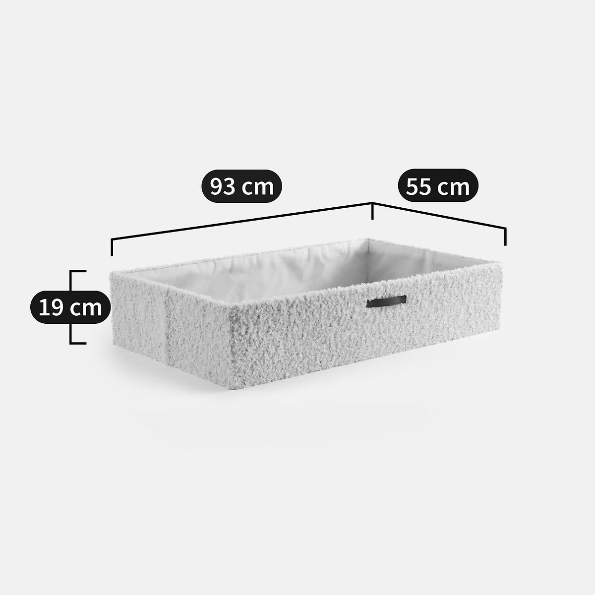 Soft, functional and foldable. The Boklio basket in a fleece finish adds a touch of tenderness to your bedroom. Slips under the bed to store magazines, children's toys, clothes.. Product Details • Outer cover 100% polyester, terry finish • 100% polyester plain non-woven interior • Cardboard structure • Polyurethane carrying handle Care Advice • Clean with a dry cloth only. Dimensions • Length: 93cm • Height: 19cm • Width: 55cm