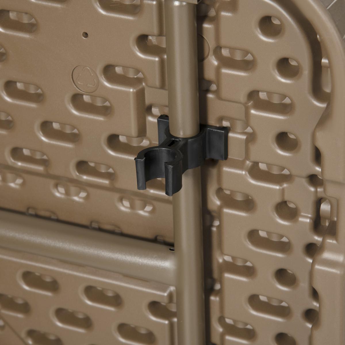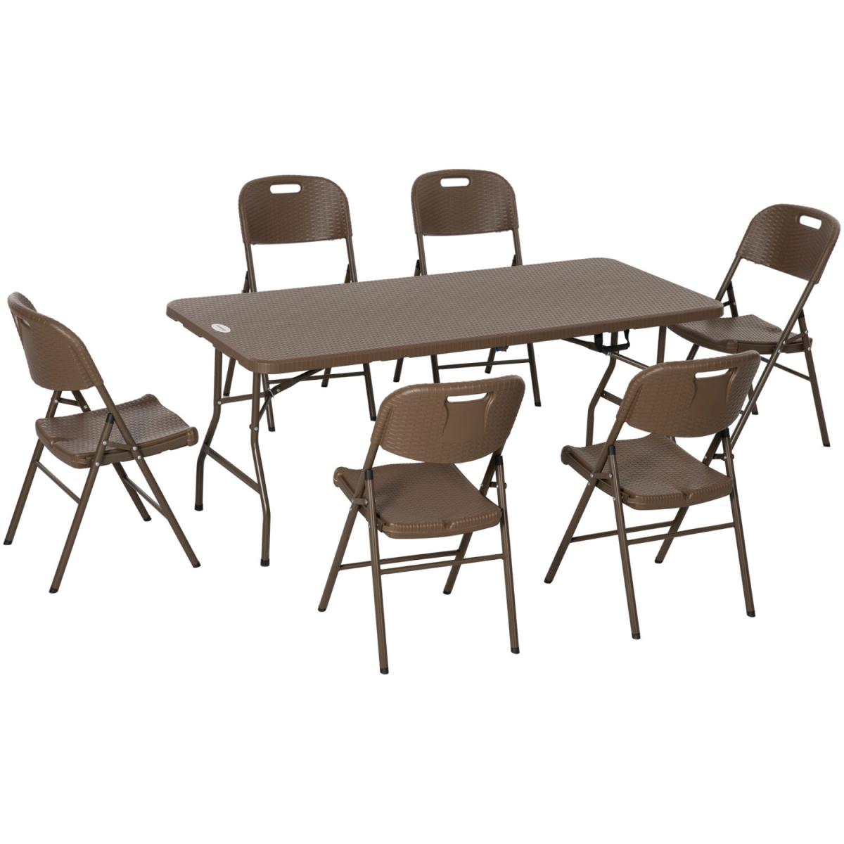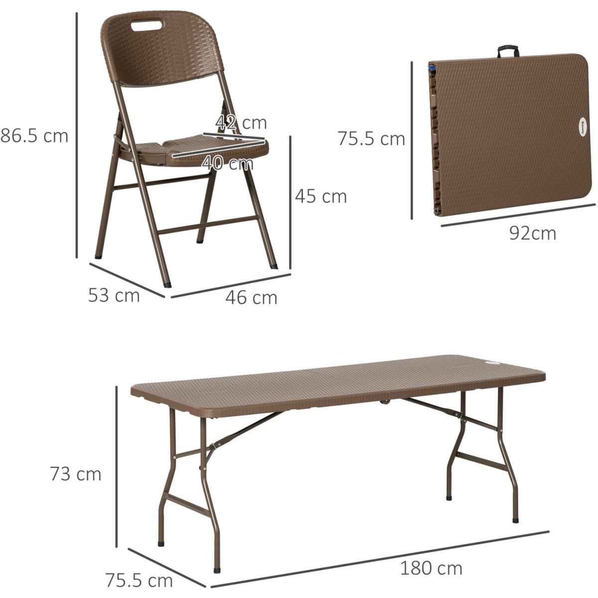 This Outsunny resin table and chairs set offers a stylish and sturdy place to dine together, outdoors. The rust-resistant metal frames mean a strong core, fitted with plastic seats, back and tabletop, in a rattan-effect design for a stylish look. The large table is spacious enough for everyone to gather round and dine from. When done, or whenever you want to move the set, all the pieces can be folded.