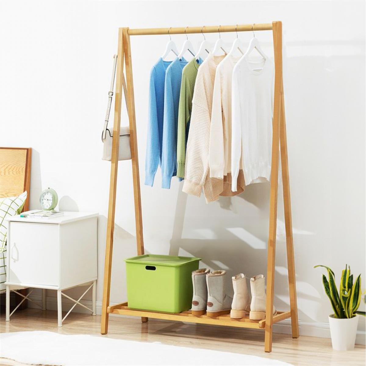 Looking for a versatile coat rack or plant display stand? This rack serves both purposes effortlessly. Its long hanging bar provides plenty of space, ideal for hanging clothes or suspending plants, making it easy to organize outfits or tend to your plants. A bottom shelf adds extra storage, perfect for shoes, pots, or other items. Its foldable design allows for easy movement and placement wherever you need, whether for convenience or showcasing greenery. Made from solid wood with a sturdy triangular frame, this simple yet stable rack combines functionality and style, enhancing both organization and elegance in your home.