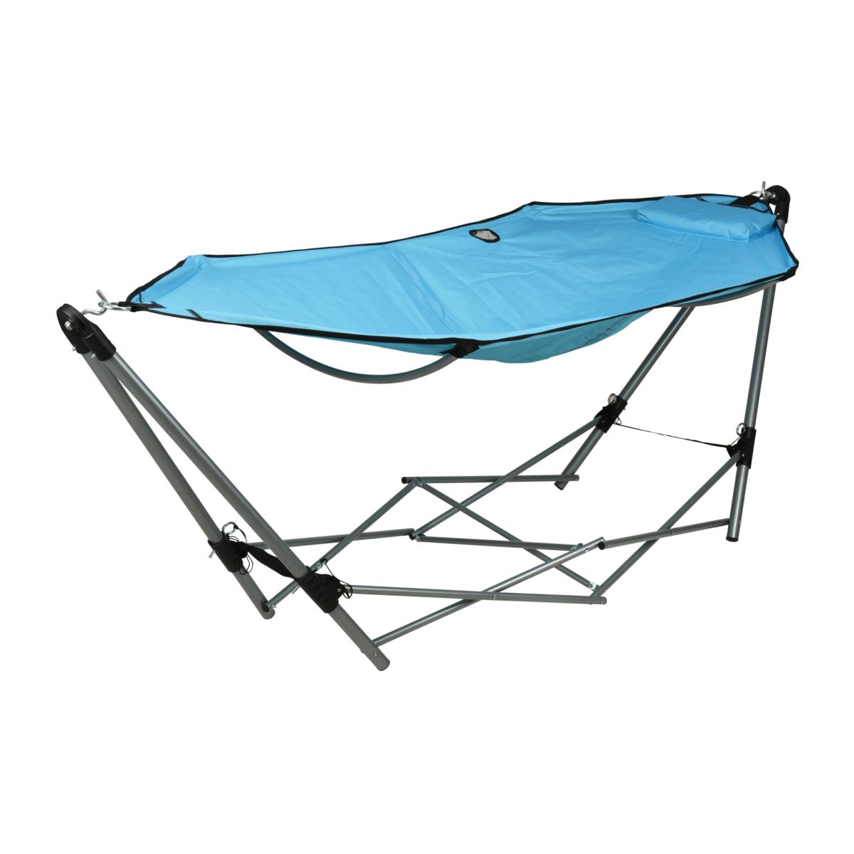 This Foldable Stand with Hammock is a comfortable and convenient way to relax while camping. When fully assembled, the hammock is suspended above a sturdy metal frame, making it the perfect spot to unwind after a long day of hiking and exploring. When you're ready to pack up and move on to your next destination, the entire set can be easily folded up and stored in the included bag with carry handles. So go ahead and kick back in style on your next camping trip. Foldable Stand with Hammock - Blue