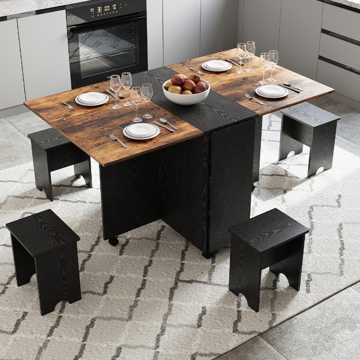 This space-saving foldable wood-effect dining table and 4 stool set adapts to your needs, transforming from a compact side table to a full dining surface for casual meals or gatherings. The hard-wearing wood-effect table glides smoothly on wheels, fitting snugly into kitchens or cosy flats. Four matching stools tuck neatly into built-in storage, keeping your space tidy when not in use. Its timeless black-and-wood finish blends with modern or rustic decor effortlessly. Perfect for small homes, it offers flexible seating without sacrificing style or floor space.
