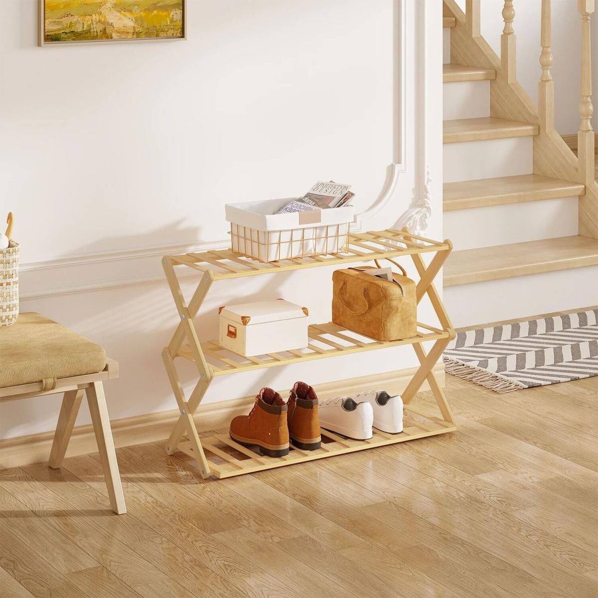 Folding 3 Tier Bamboo Shoe Rack Portable Shoe Shelf - Natural