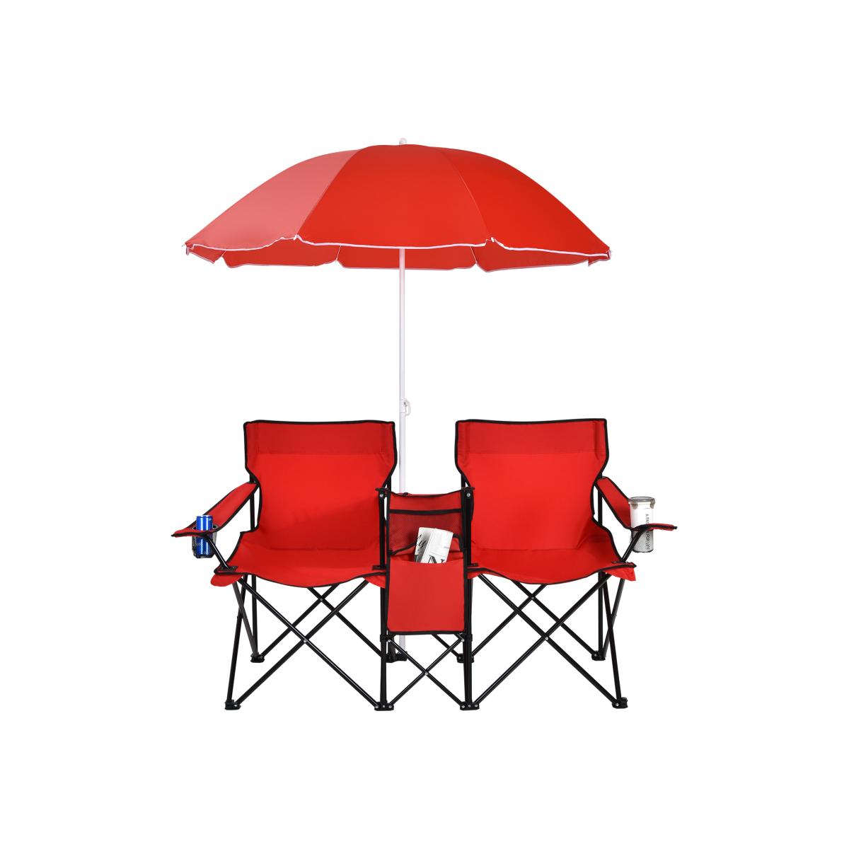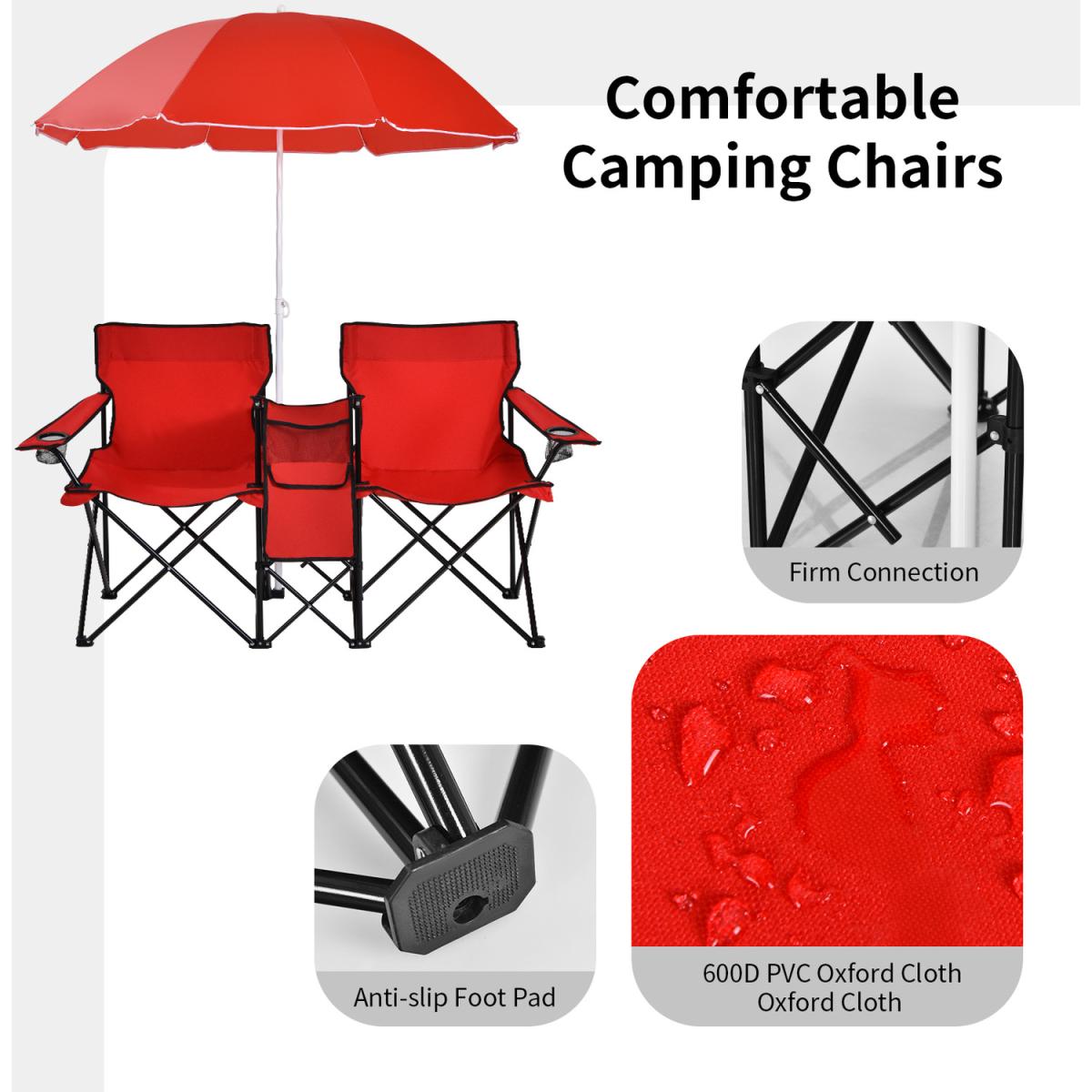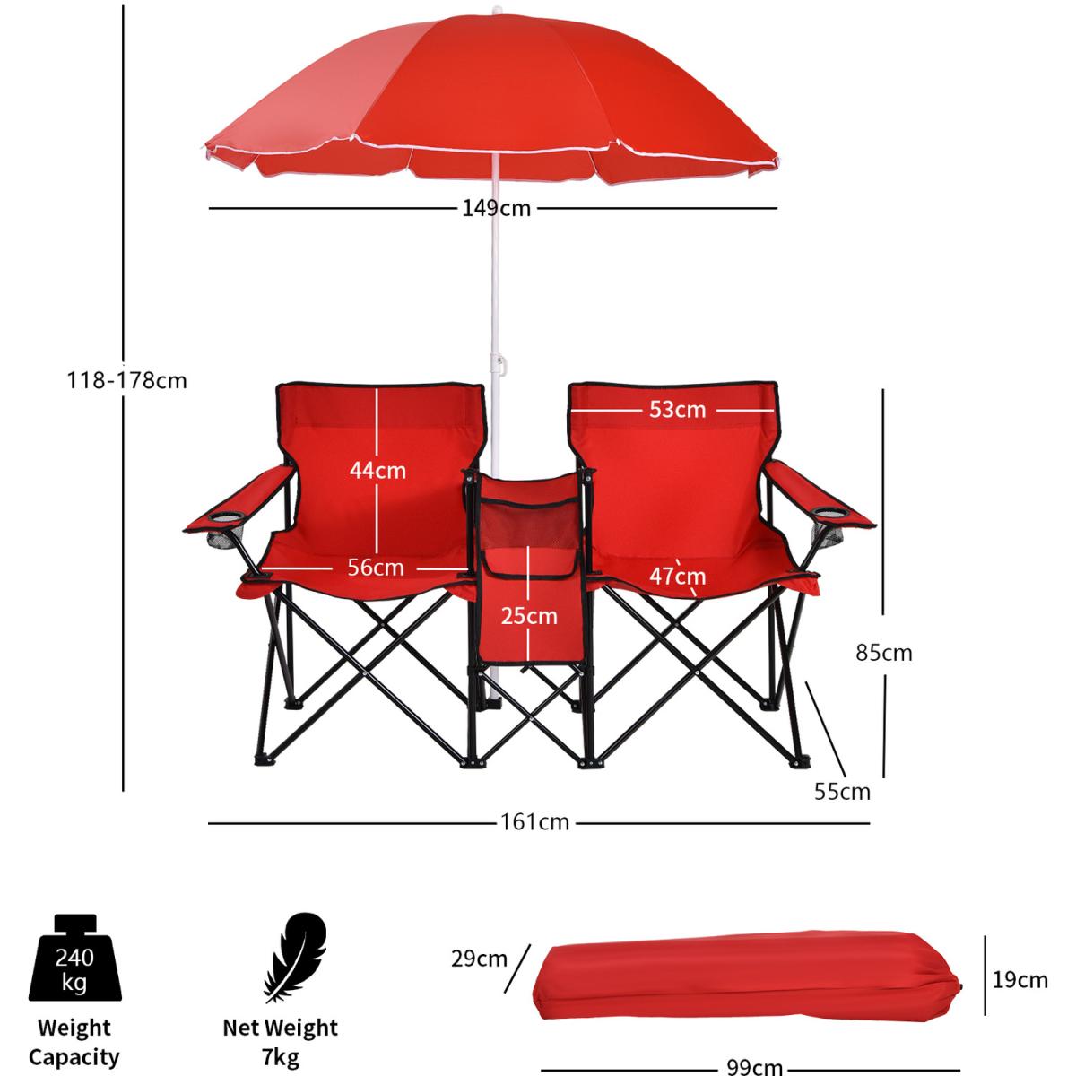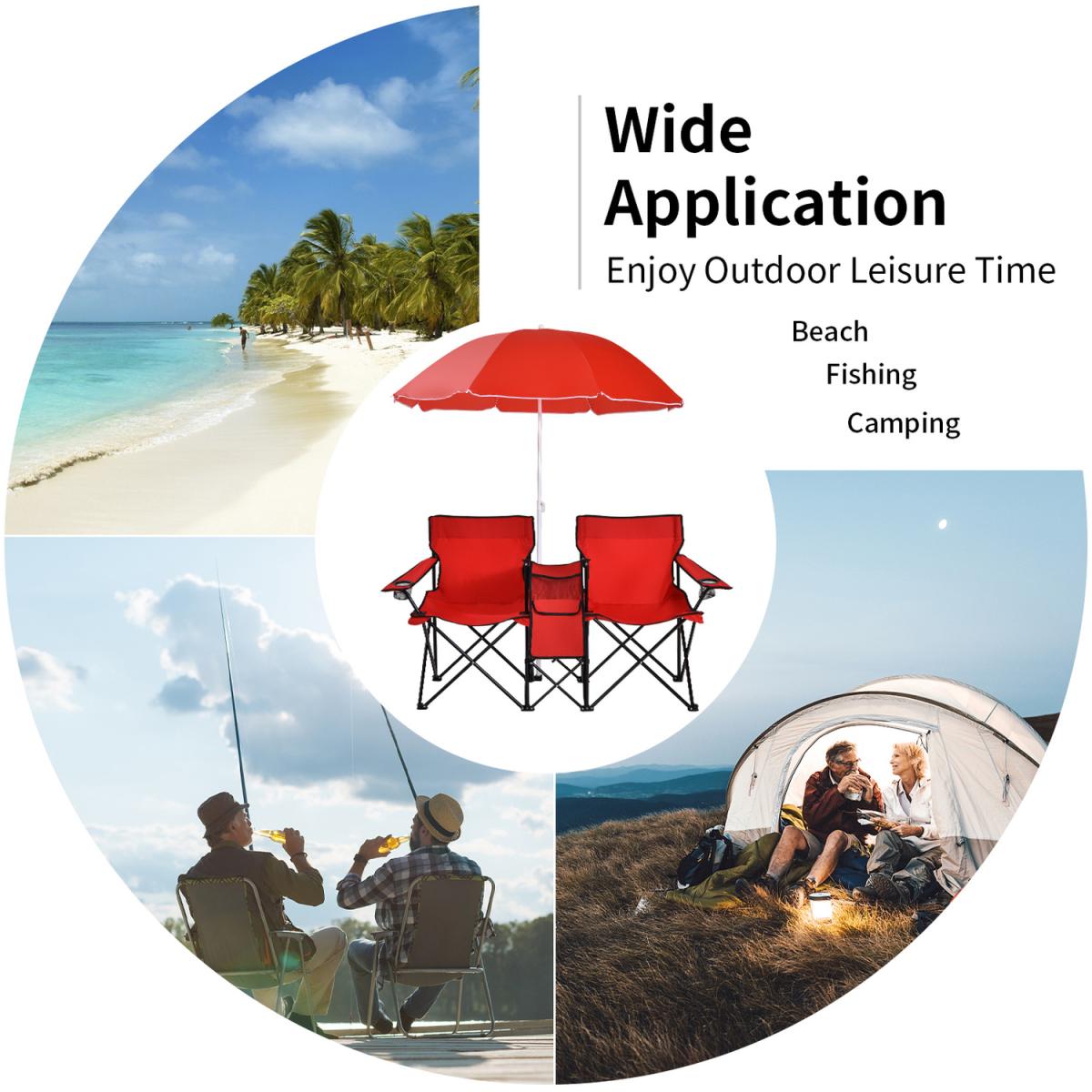 This folding chair set brings a cozy place for you and your lover to relax in leisure time. It is designed with ergonomic reclining backrests and comfortable armrests for optimal relaxation and support. Beyond the comfort it provides, the love chair set has a long service life with sturdy steel frame and premium PVC Oxford fabric. Plus, the removable umbrella allows it to be used in any weather. The bulit-in cooler can store your Ice drinks. For your better experience, this portable chair set is equipped with beverage holder and storage pocket, which provides a useful space for storing personal items such as books, mobile phones and so on. It is an ideal choice for lovers to enjoy picnics, camping, barbecues and other outdoor activities. When you are ready to go hiking, you only need to fold the chair set and put it in the included carrying bag, and then go on the road!