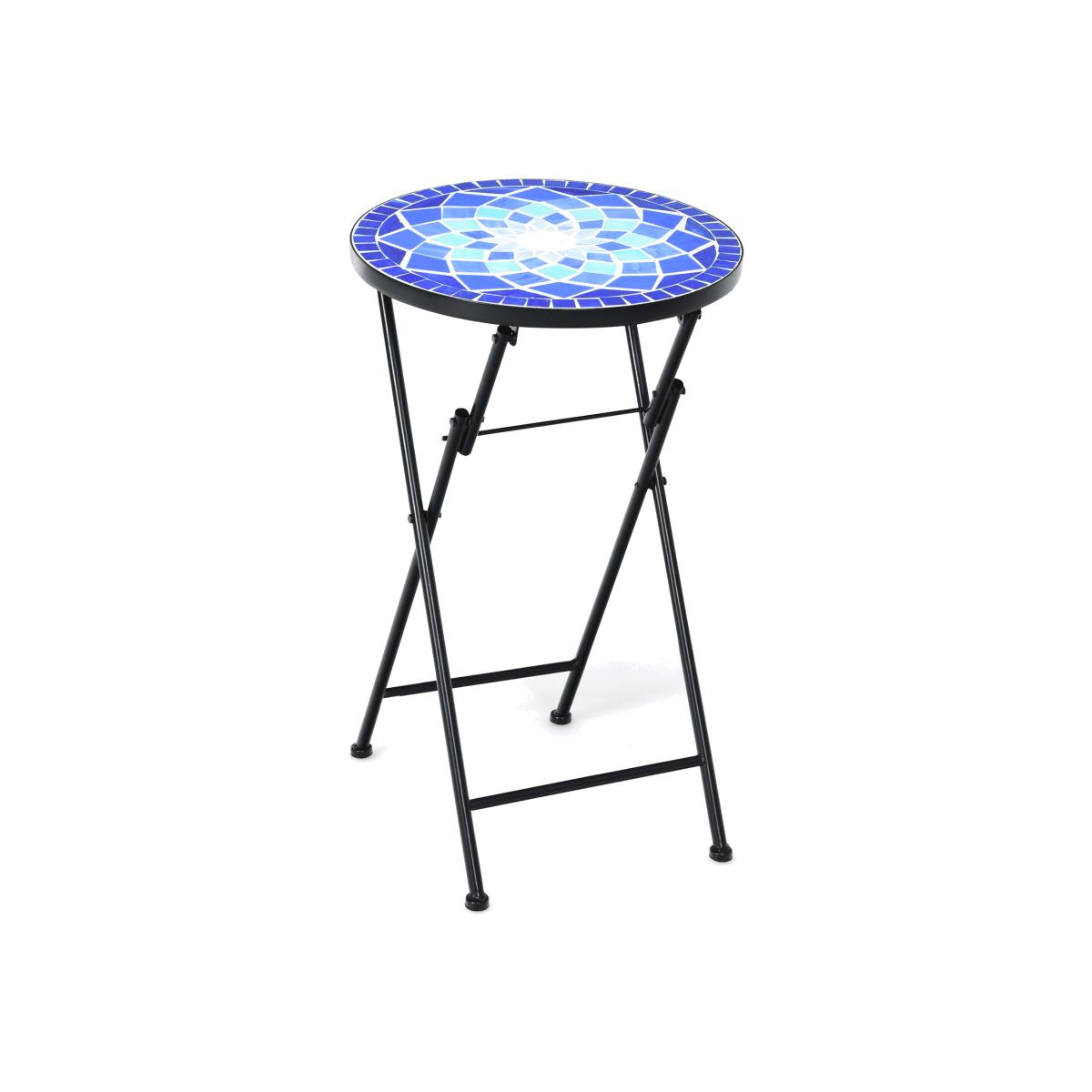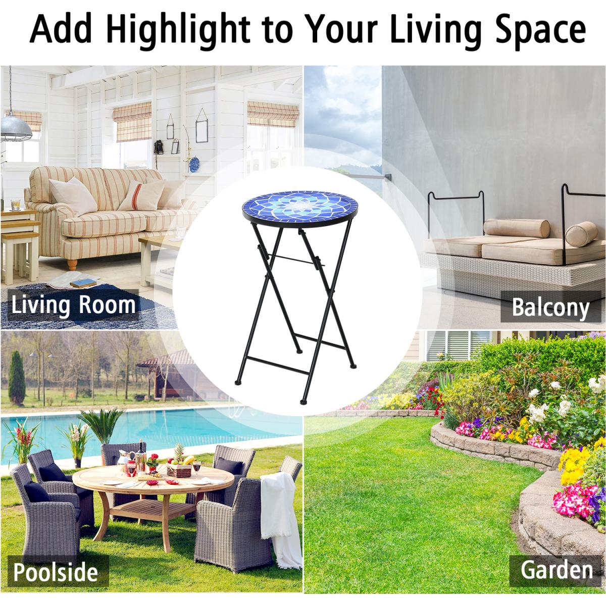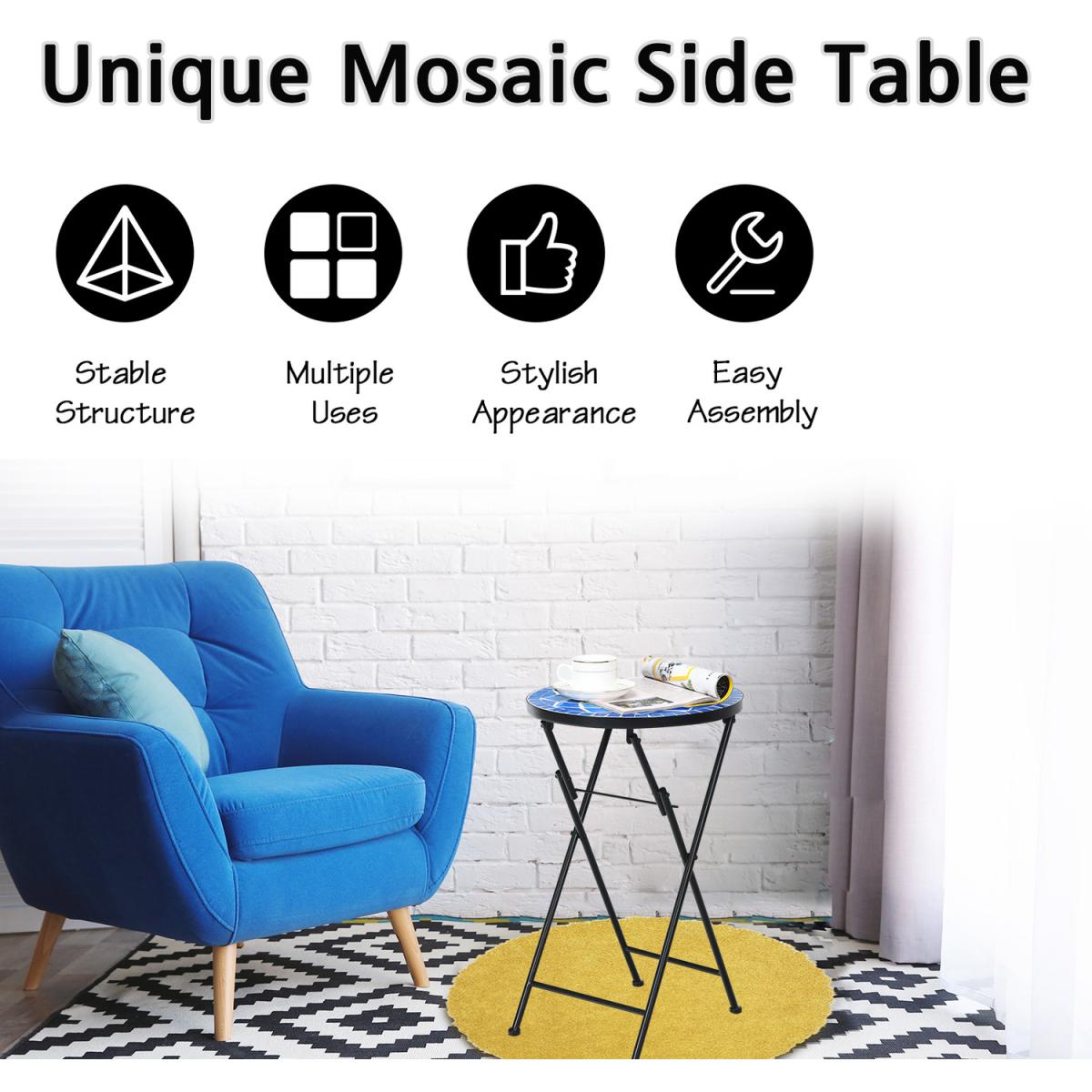 Lighten up your indoor and outdoor occasions with our mosaic side table!The side table comes with beautiful mosaic pattern and ceramic tile top that add a unique charm to your home. It is smartly made to be placed at any small spaces like the corner of your patio or perfectly fit any large space. Folding design also brings much convenience to store and carry around. The steel construction with anti rust coating makes this table sturdy and durable. The table can be also used for plants to decorate your space or placed beside the sofa as a side table. Moreover, it is a perfect choice to set a coffee when combined with a chair to create a cozy area.