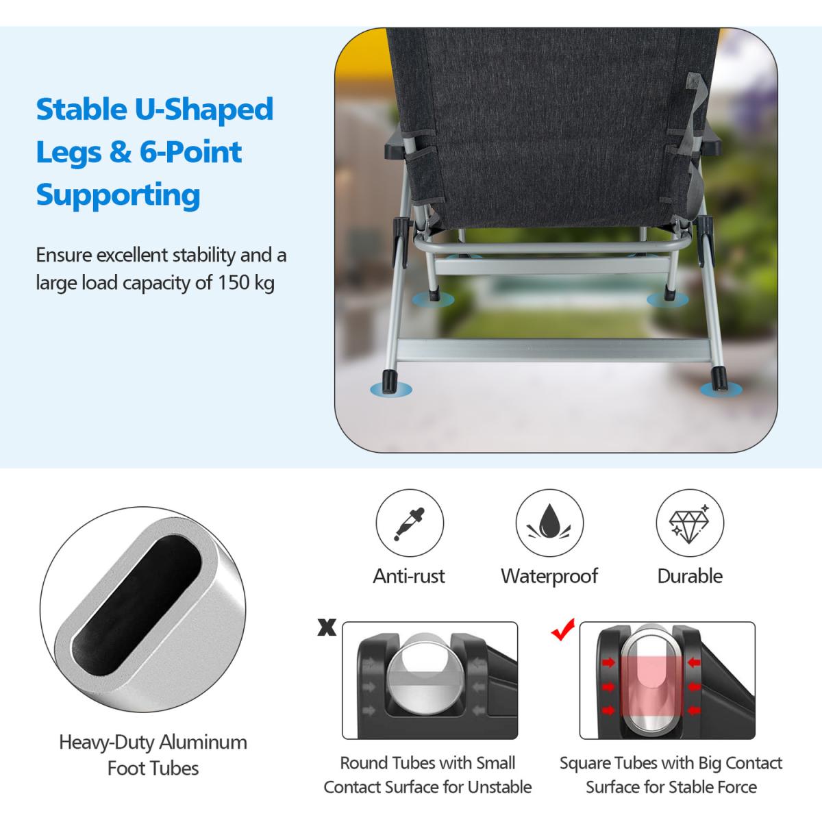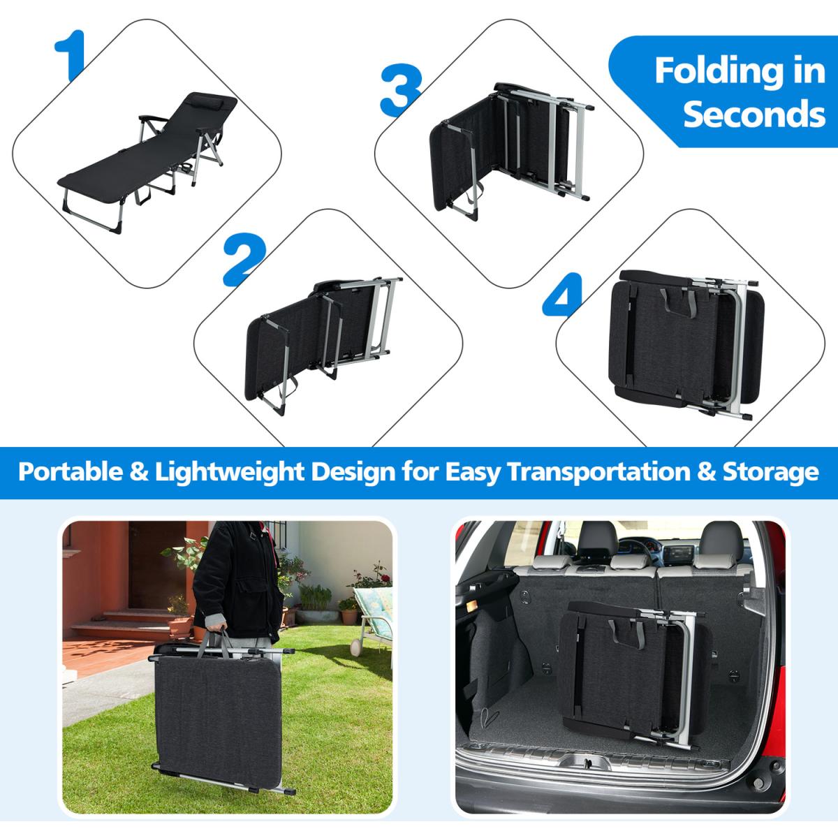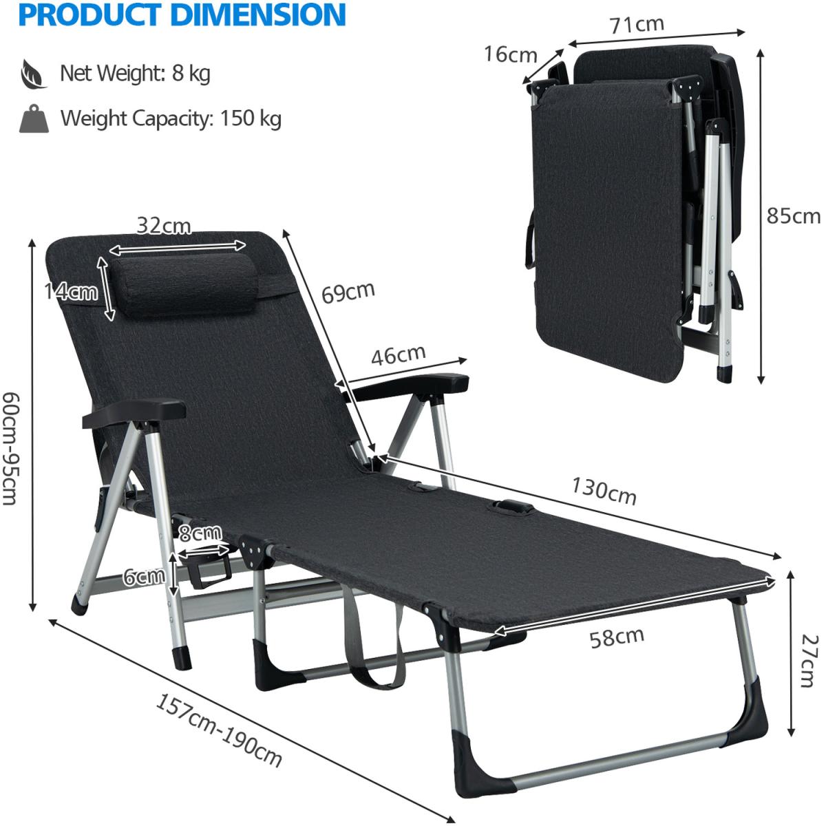 Must have foldable lounge chair for outdoor recreation!Our chaise lounge is suitable for both indoor and outdoor use. With its convenient foldable design, you can carry it with side straps for easy transportation and stored it in limited spaces. And you can adjust the backrest into 7 positions by simply moving the armrests back and forth until you find the ideal angle of backrest. Moreover, you can relax your head and neck on the thick padded sponge headrest. The surface of the sleeping recliner is made of high density fabric, which is featured by its excellent waterproof and breathable ability. Besides, our lounger with flat aluminum frame has stronger loading capacity up to 150kg.