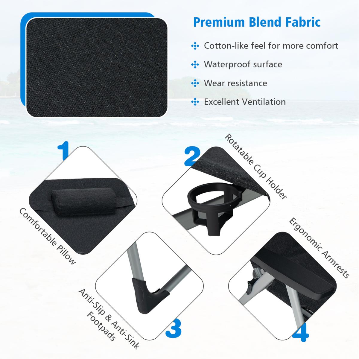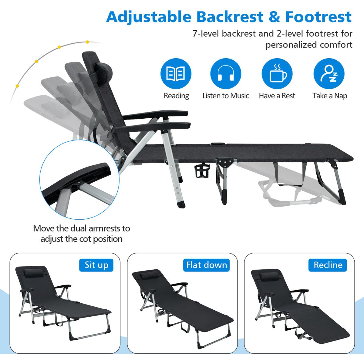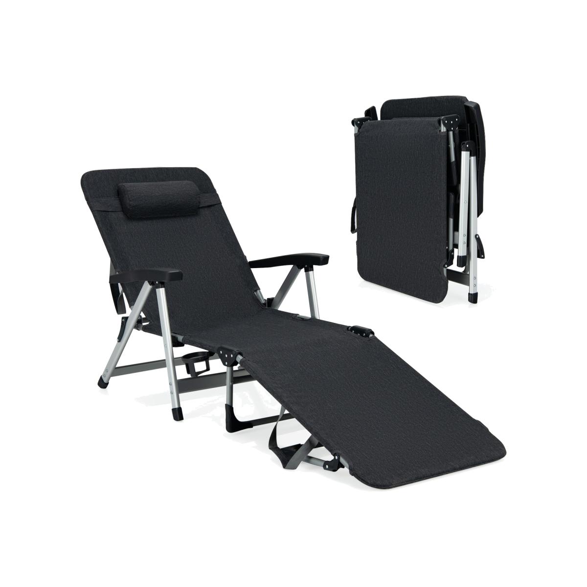 Must have foldable lounge chair for outdoor recreation!Our chaise lounge is suitable for both indoor and outdoor use. With its convenient foldable design, you can carry it with side straps for easy transportation and stored it in limited spaces. And you can adjust the backrest into 7 positions by simply moving the armrests back and forth until you find the ideal angle of backrest. Moreover, you can relax your head and neck on the thick padded sponge headrest. The surface of the sleeping recliner is made of high density fabric, which is featured by its excellent waterproof and breathable ability. Besides, our lounger with flat aluminum frame has stronger loading capacity up to 150kg.