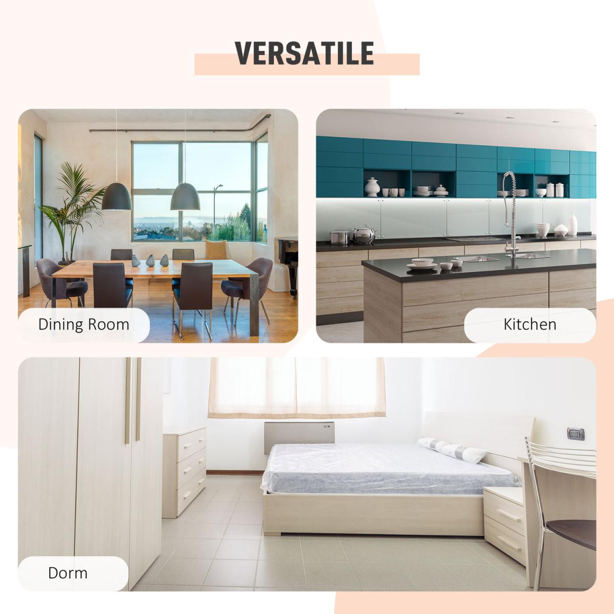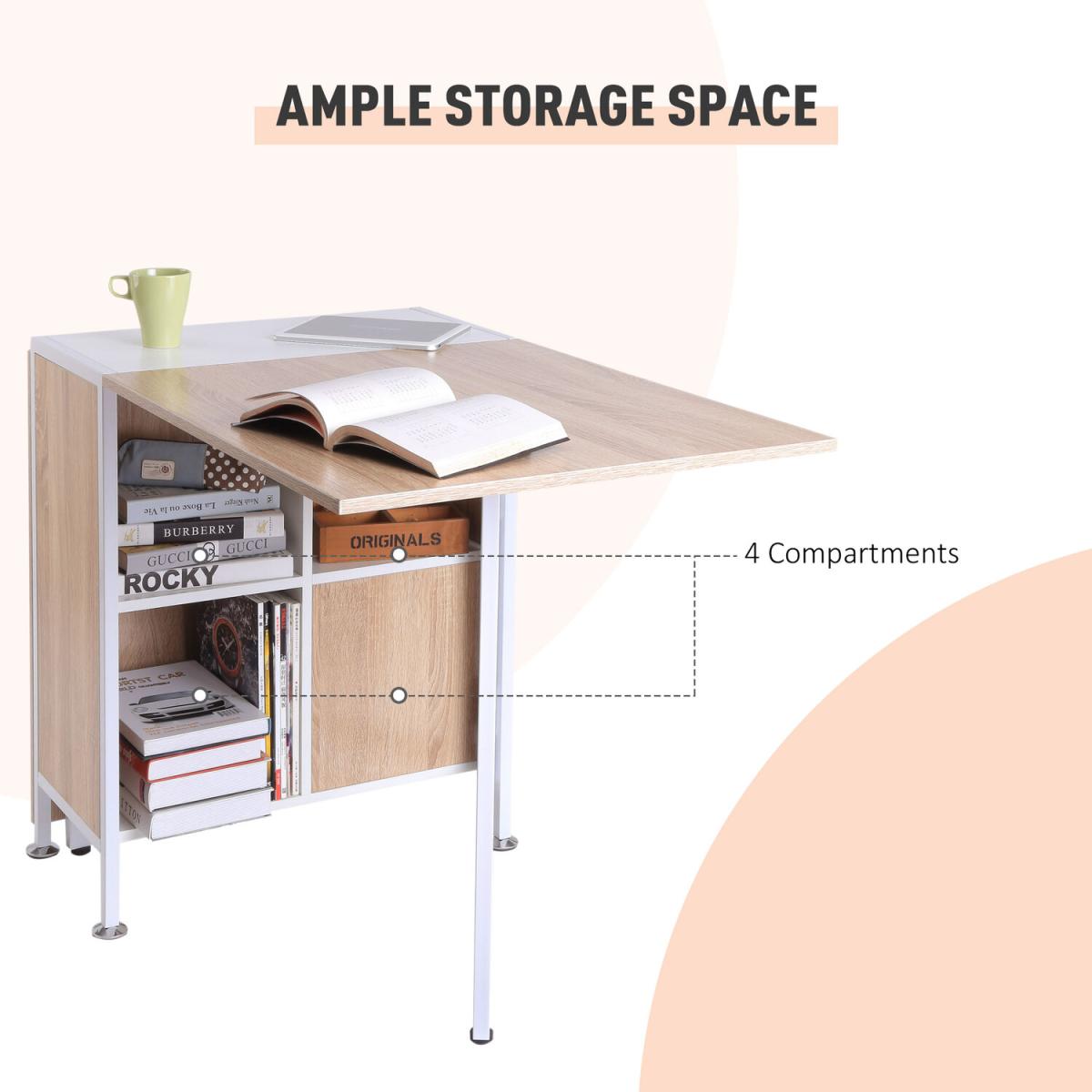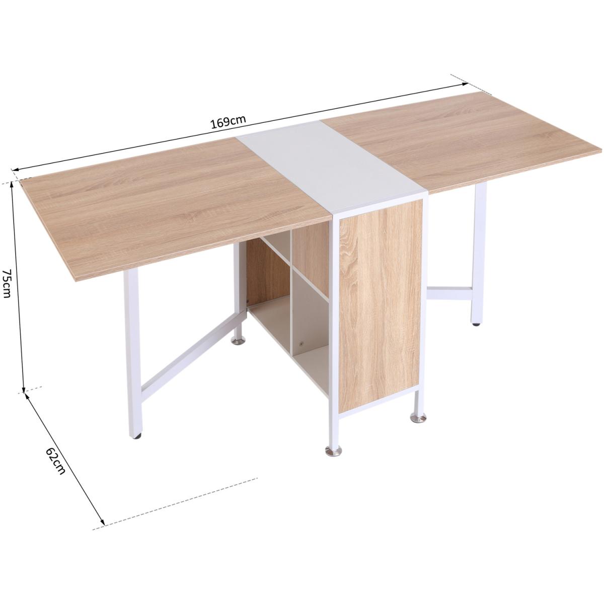 Redefine your home or office with this versatile folding table from HOMCOM. With its easy-to-operate folding system, you can use it as a computer workstation, writing or laptop desk, a corner table, a wall table, or else. Meanwhile, it brings extra storage options with 4 shelves under the desktop, helping store and organise your household accessories, study, and office essentials, or display ornaments. Constructed from MDF board in oak colour and metal frame with white finish, this desk provides superior stability and durability while still perfectly blending with any other furniture.