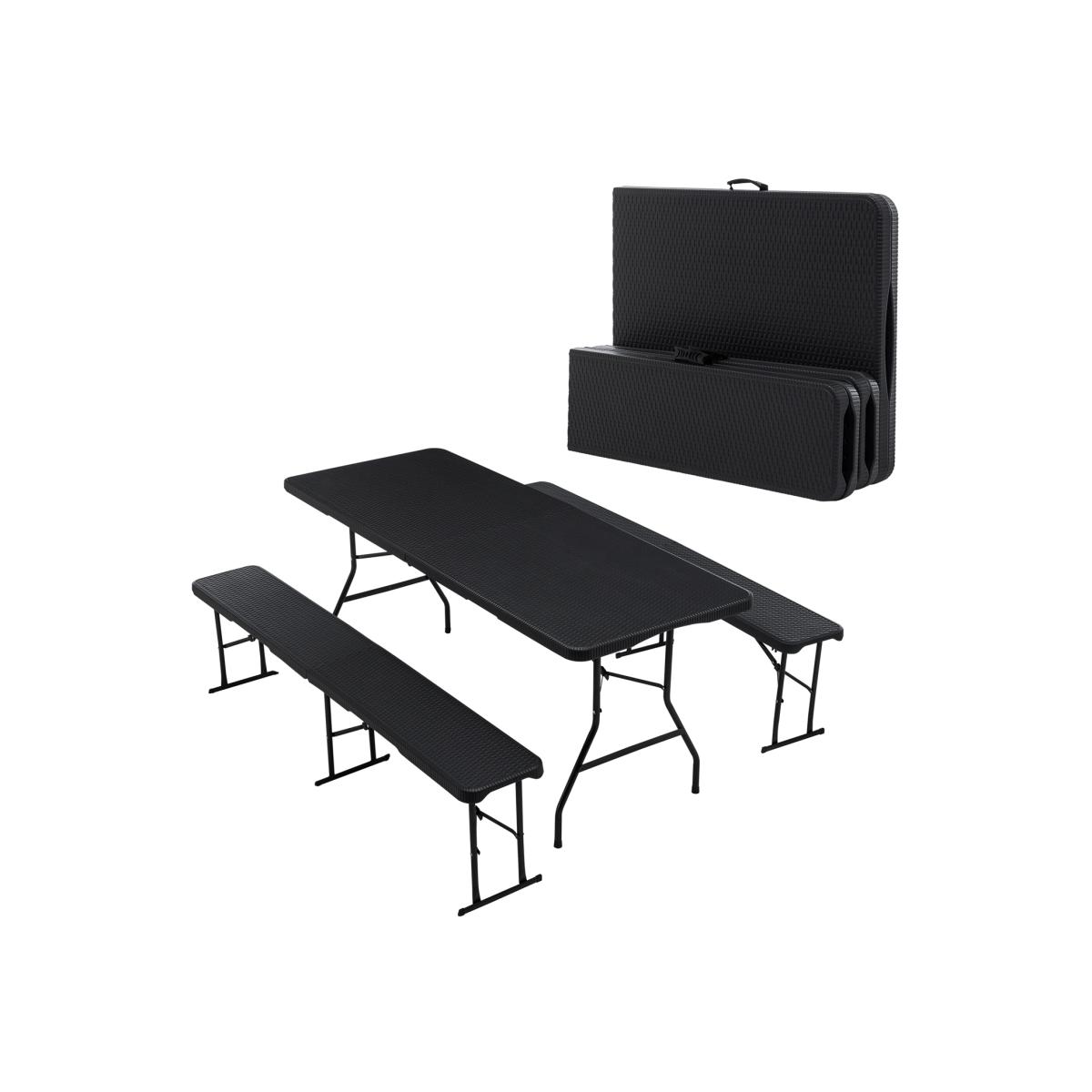 The table and benches easily fold in half, featuring built-in carrying handles for effortless storage and transportation, making it ideal for outdoor events, picnics, and gatherings.