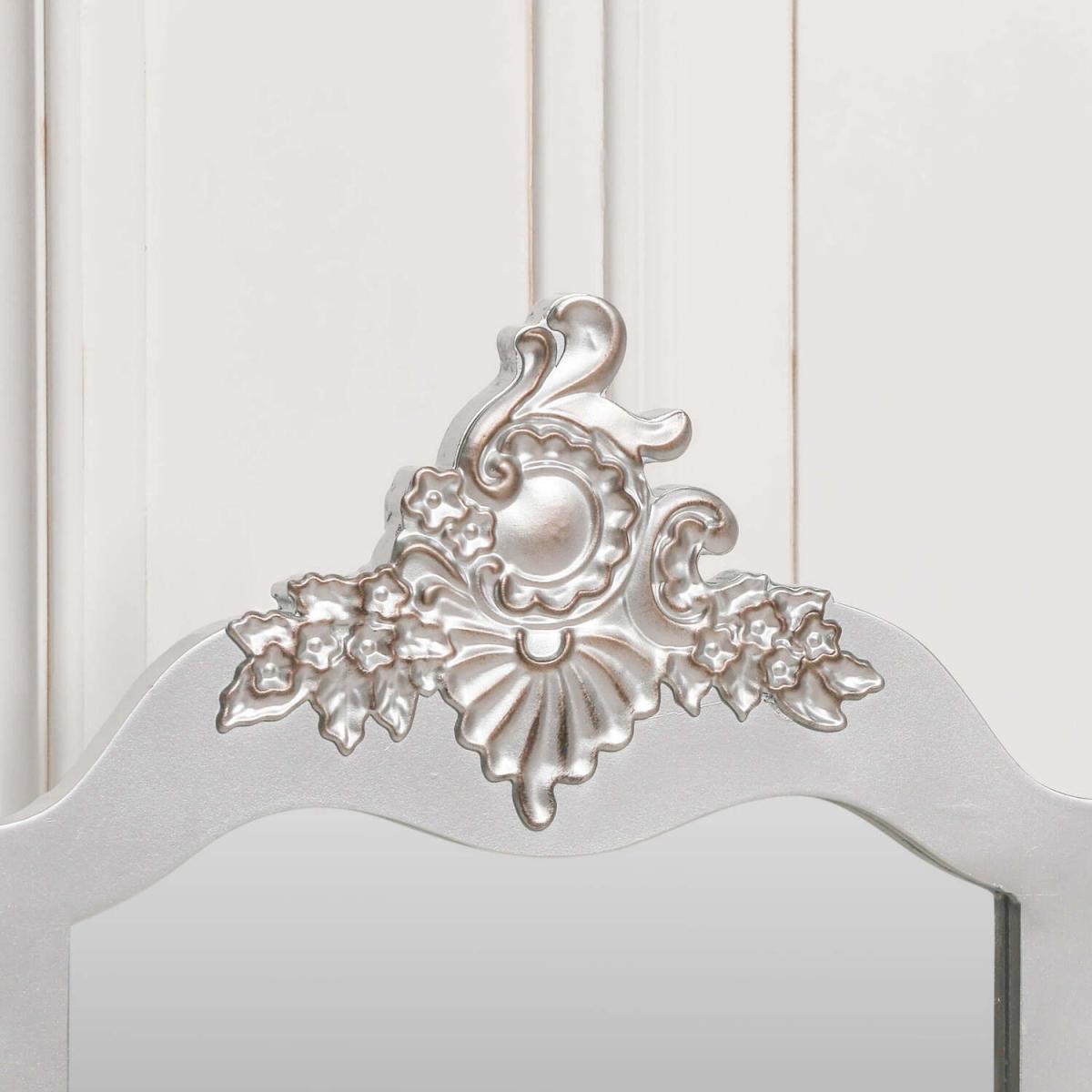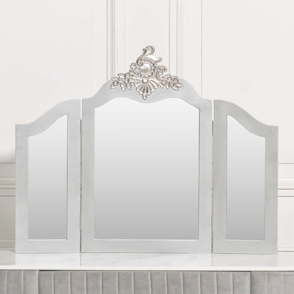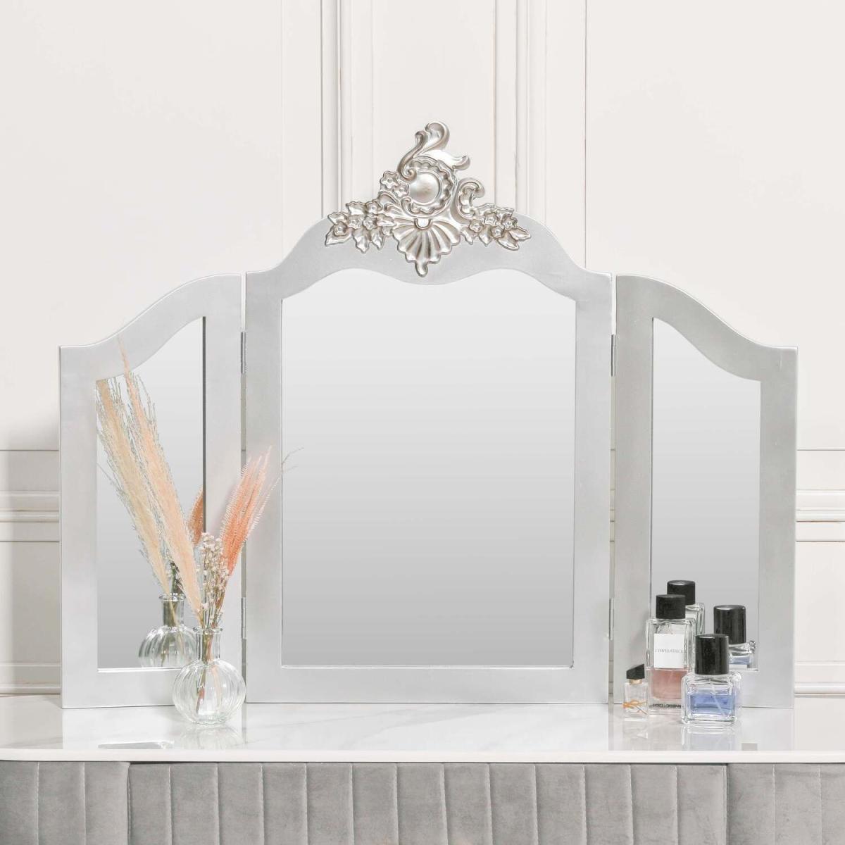 Looking for a timeless accent to your dressing room's interior? This folding three-piece dressing table top mirror in Antique Silver is just the perfect piece. Crafted with a French Style, the Silver Triptych Dressing Table Top Mirror features a beautiful motif crown to add an elegant, chic appeal to any room. With its classic silhouette and timeless elegance, this mirror is ideal for any vanity makeup table.