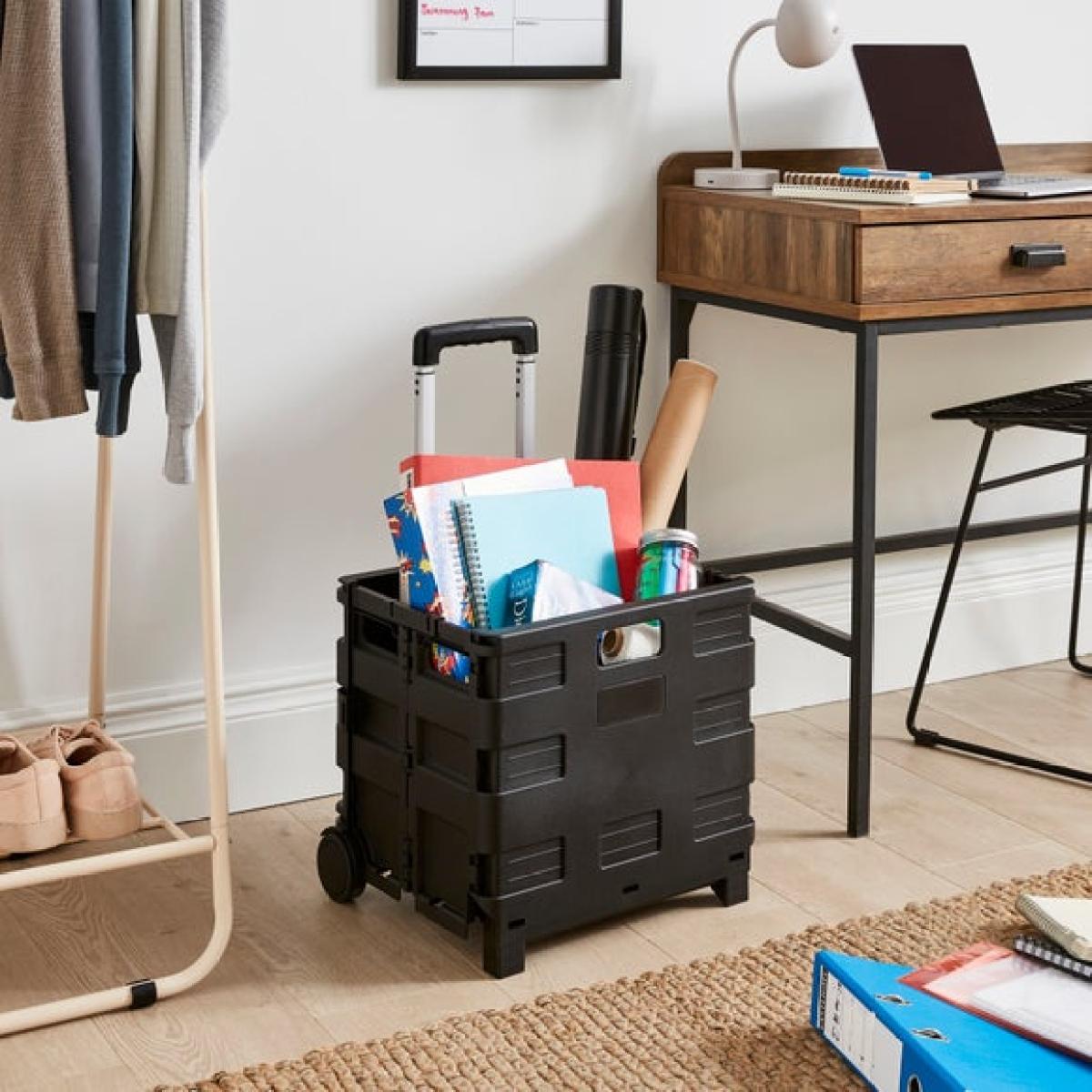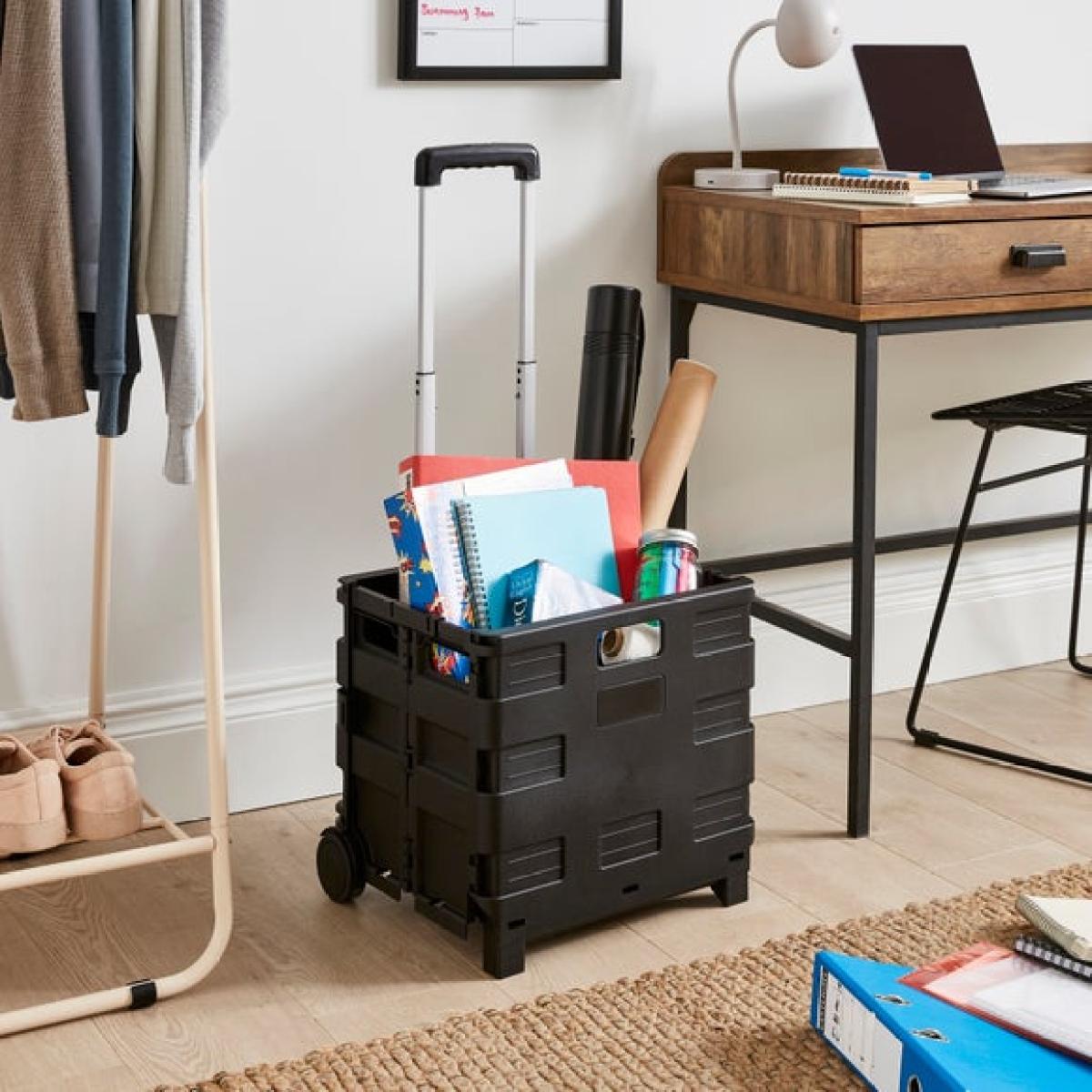 * Available in a range of colours * Easy to transport * Foldable Make life that bit easier with this Folding Trolley Storage Crate, perfect for students, shoppers, and anyone on the go. Whether you're hauling books, stationery, or your weekly food shop, this foldable trolley has you covered. It folds flat in seconds for easy storage, and the sturdy wheels make transport a breeze. Available in a range of fun colours, it adds a bright touch to everyday errands. Lightweight yet durable, it’s a smart companion for campus runs or quick trips to the shops. Practical, portable, and ready when you are.