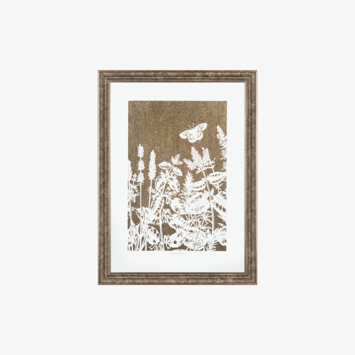 Bring understated elegance to your space with the Foliage Silhouette Framed Wall Art. This contemporary piece features delicate outlines of wildflower foliage, beautifully set against a bronze mottled foil background. Encased in a brown wood-effect frame, it seamlessly blends nature with modern design.