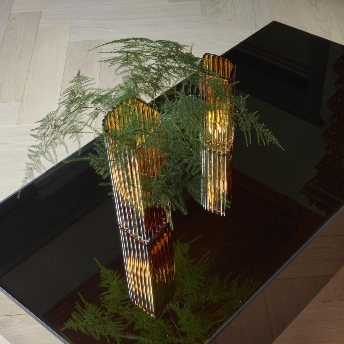 Seen from above, this stunning vase has a slightly flattened shape that resembles a leaf. The glass is worked with wide ribs, adding a sophisticated aspect to the piece.
