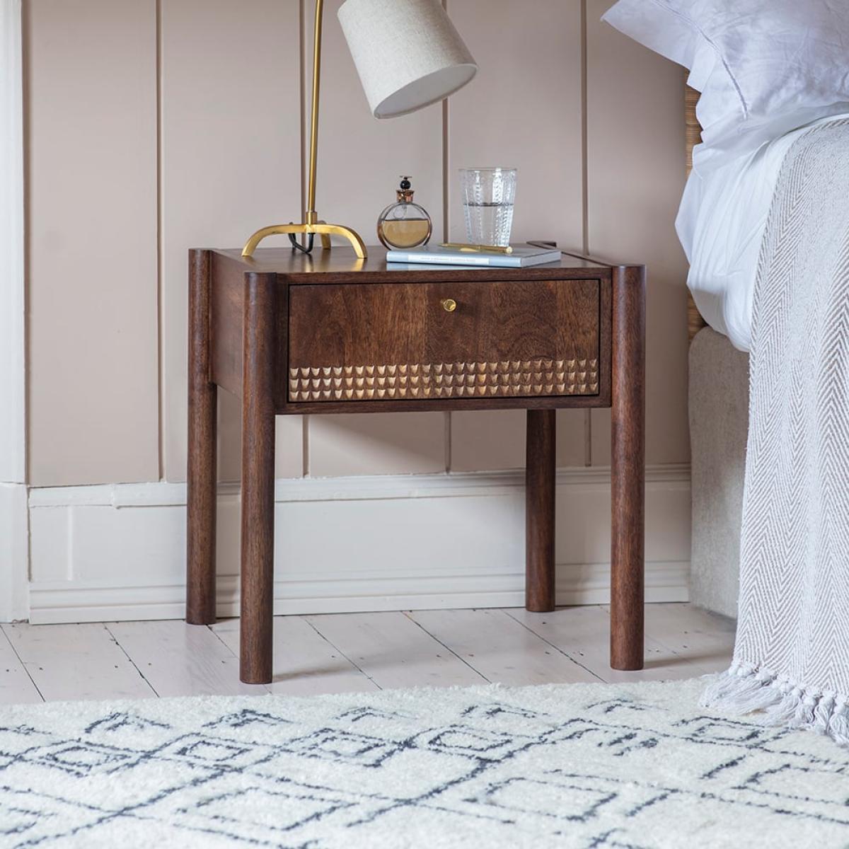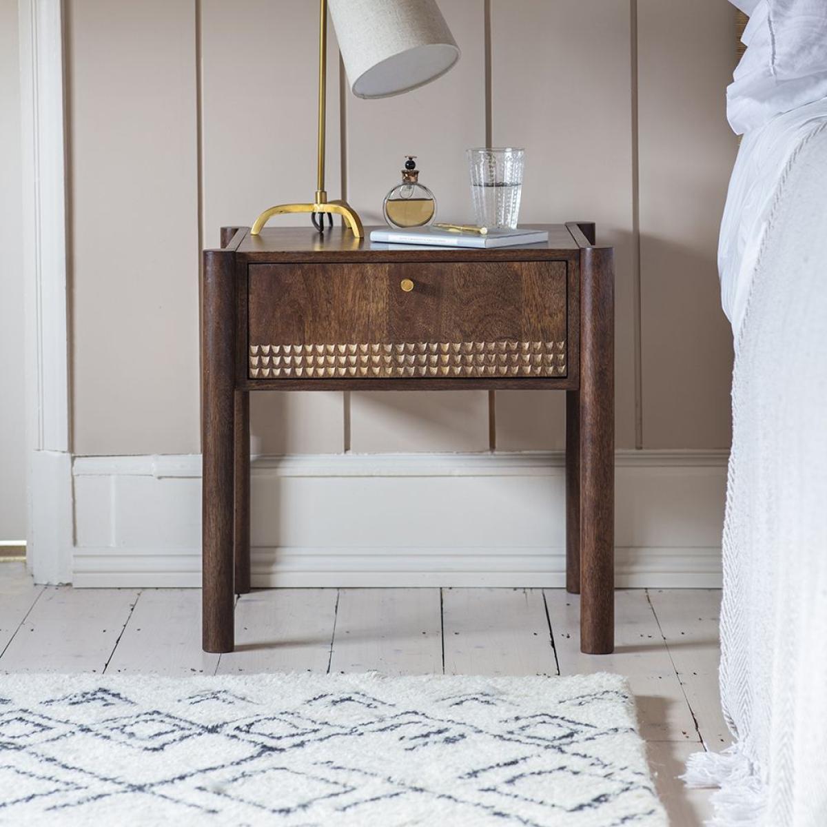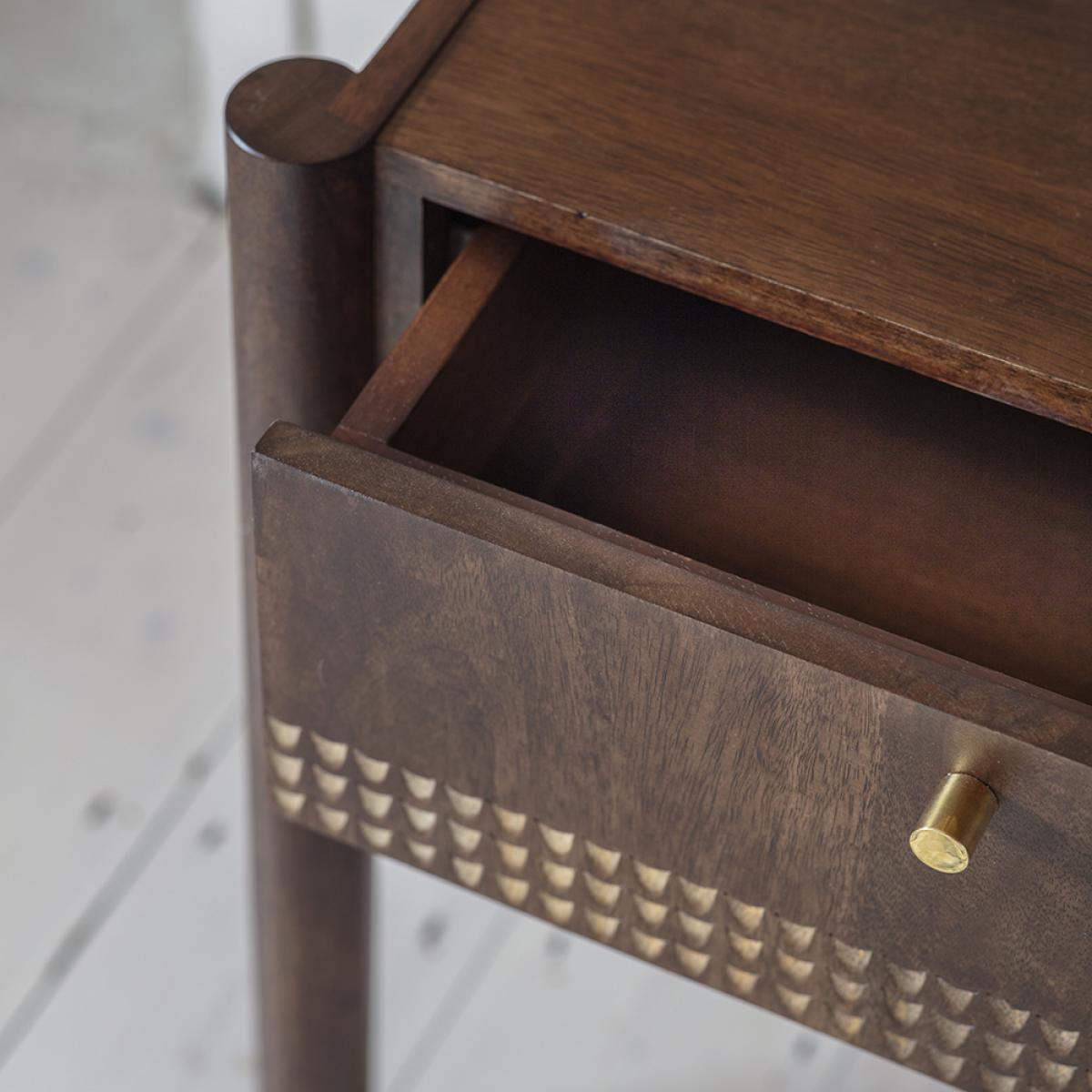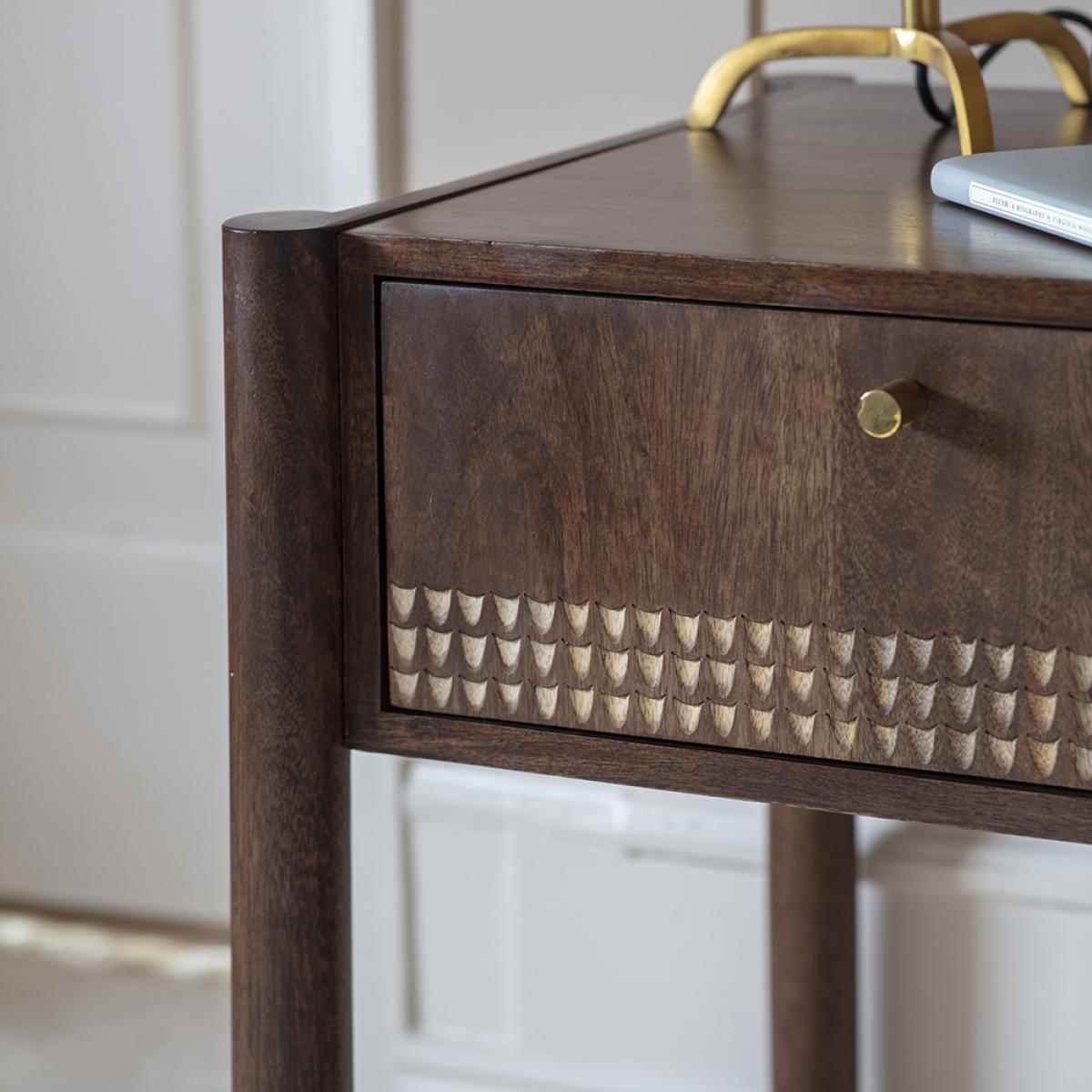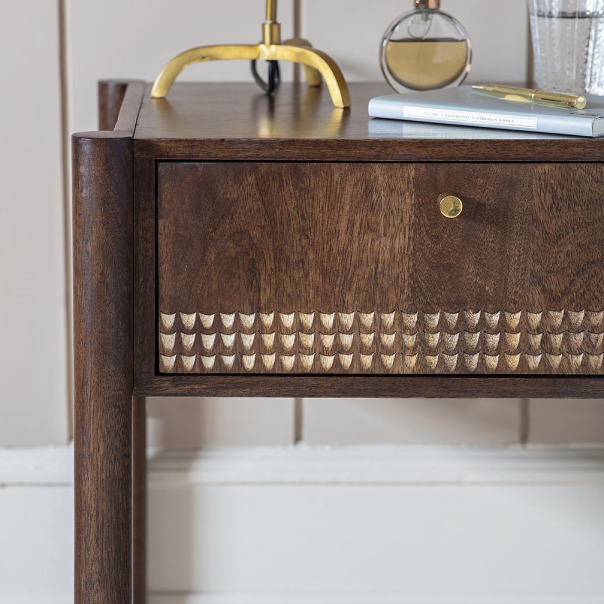 Our Folk Bedside table has endearing artisan, handcrafted appeal. Made from walnut stained mango wood, each single-drawer bedside table is carved by hand, with a carving technique inspired by Mukimono, the traditional Japanese art of decorative garnishing. This hand carved nightstand features intricate patterned detail revealing the natural mango wood beneath. Whether it’s for the main bedroom or a guest room, this contemporary wooden bedside table will make an understated impact on your bedroom scheme. Each product is unique, and due to the nature of the way it is hand carved, the detail on each piece looks slightly different – we think this is what makes the Folk range so special, and we hope you agree.