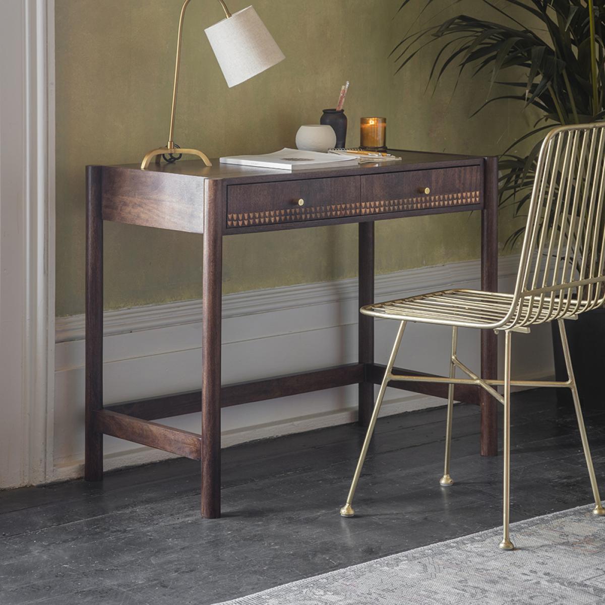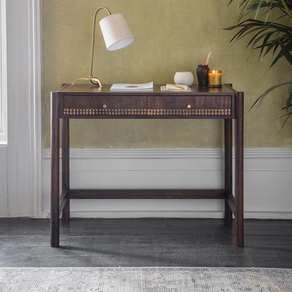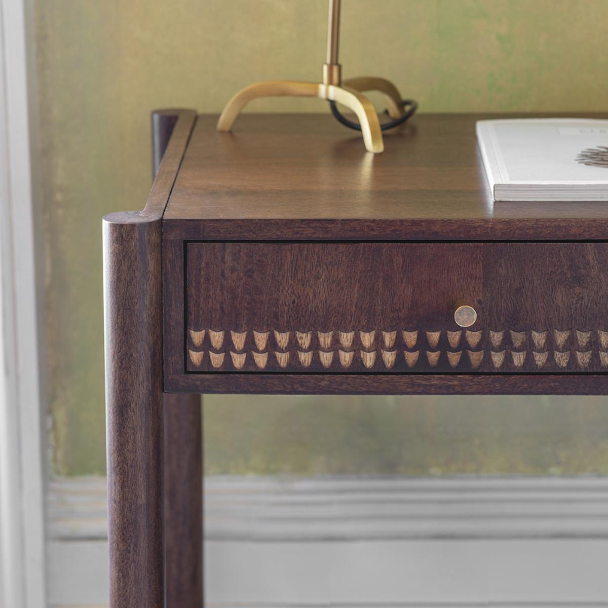 For an artisan, handcrafted look in the bedroom, home office or living space, our Folk Desk can be used as a dressing table or a handy spot for working from home or studying. Made from walnut stained mango wood, each wooden desk is carved by hand, with a carving technique inspired by Mukimono, the traditional Japanese art of decorative garnishing. The hand carved two-drawer design features intricate patterned detail revealing the natural mango wood beneath with each piece being totally unique. Each product is unique, and due to the nature of the way it is hand carved, the detail on each piece looks slightly different – we think this is what makes the Folk range so special, and we hope you agree.