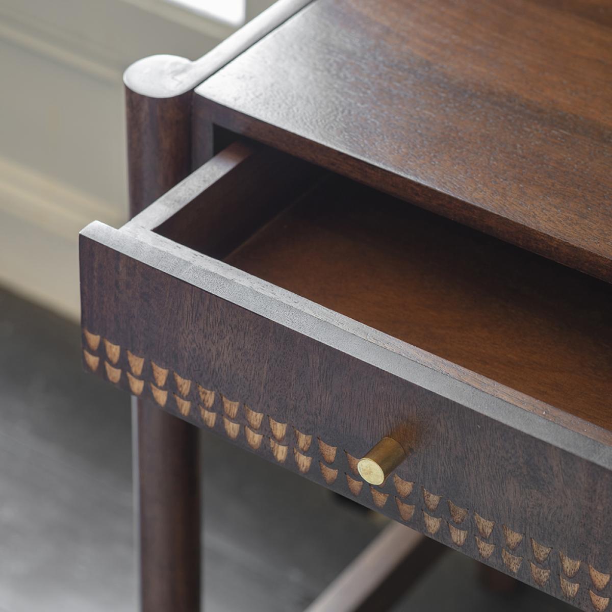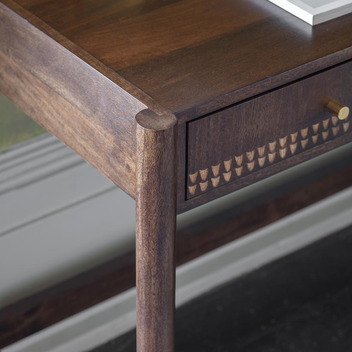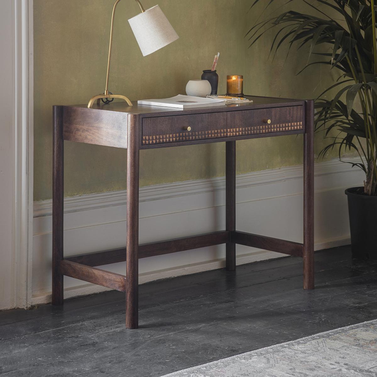 For an artisan, handcrafted look in the bedroom, home office or living space, our Folk Desk can be used as a dressing table or a handy spot for working from home or studying. Made from walnut stained mango wood, each wooden desk is carved by hand, with a carving technique inspired by Mukimono, the traditional Japanese art of decorative garnishing. The hand carved two-drawer design features intricate patterned detail revealing the natural mango wood beneath with each piece being totally unique. Each product is unique, and due to the nature of the way it is hand carved, the detail on each piece looks slightly different – we think this is what makes the Folk range so special, and we hope you agree.