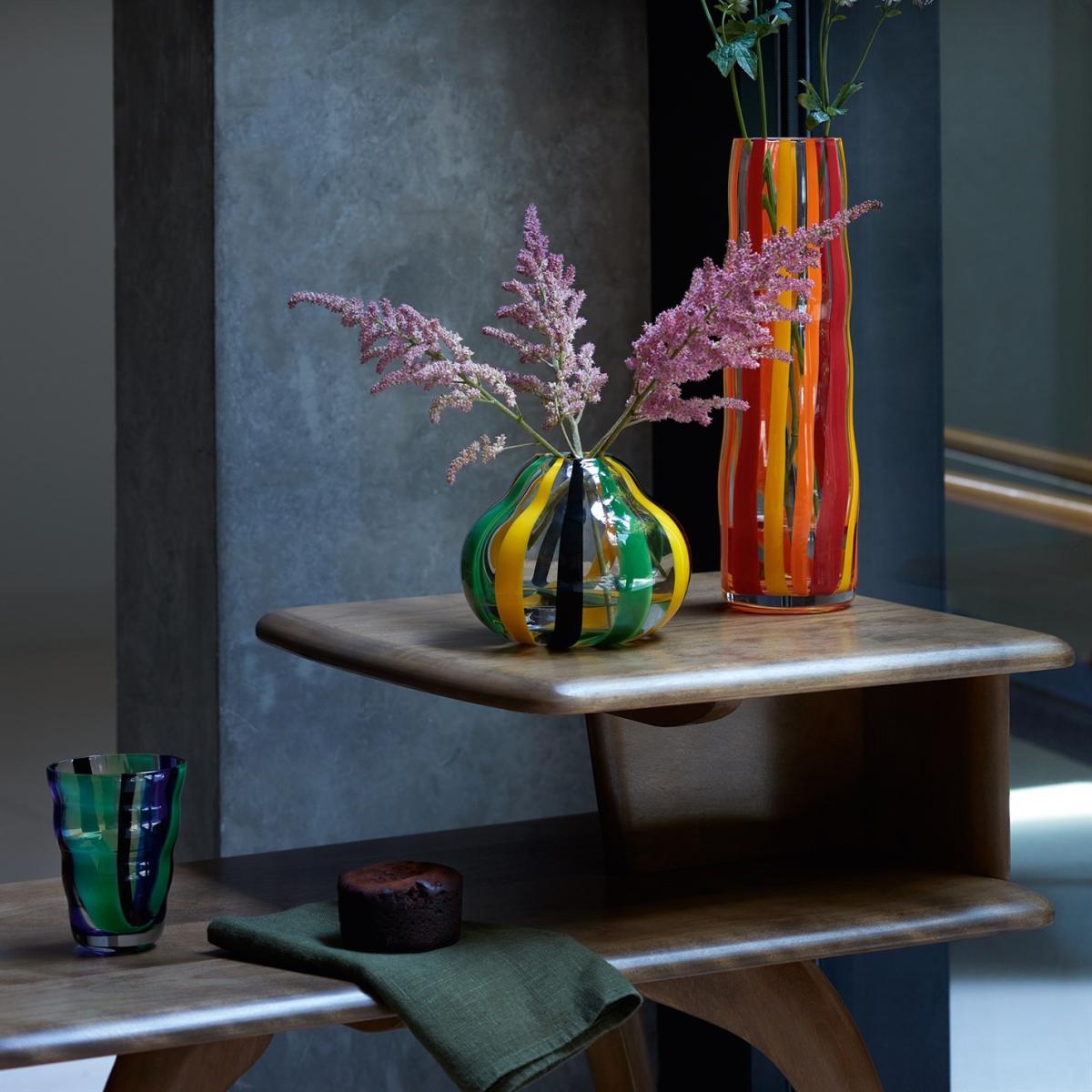 A mouth-blown vase with a distinctive folk-inspired pattern and rounded form. Ideal for single stems, small displays and table centrepieces.