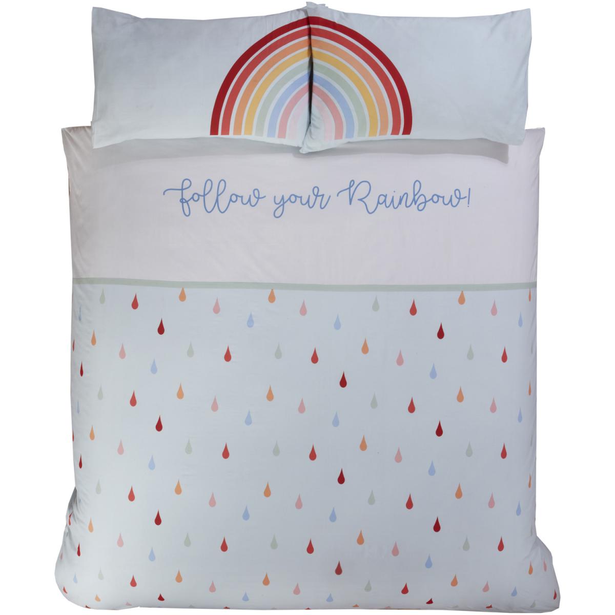 This beautiful rainbow design features a printed top cuff on a base of rain drops, in a palette of muted bright colours. This design also freatures unique pillowcases that combine to give a rainbow image, giving this quirky design it's name.