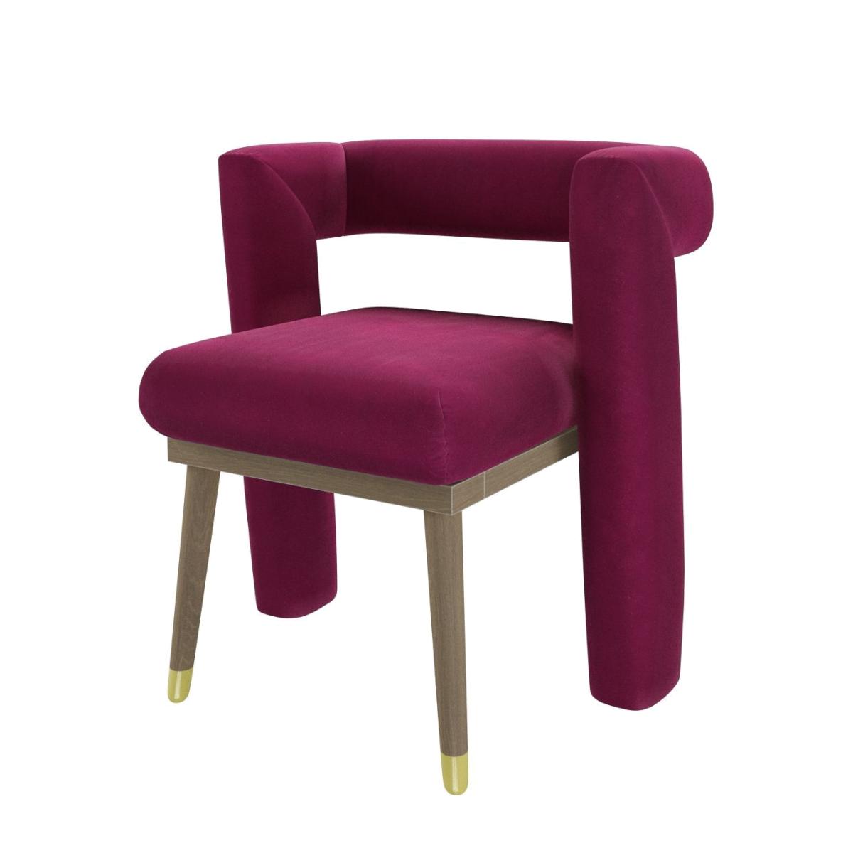 I love this chair for its bold colour and modern silhouette. Its Persian Rose velvet adds a touch of luxury, making it a statement piece perfect for eclectic or contemporary dining spaces. It's versatile enough to be paired with neutral-toned tables for a pop of colour, or combined with other rich hues for a layered look. Practical styling tips include keeping the surrounding decor understated to let the chair stand out, or layering with textured placemats and cushions to soften the look. The plush velvet also ensures comfort, making it as functional as it is fashionable in both casual and formal dining rooms.