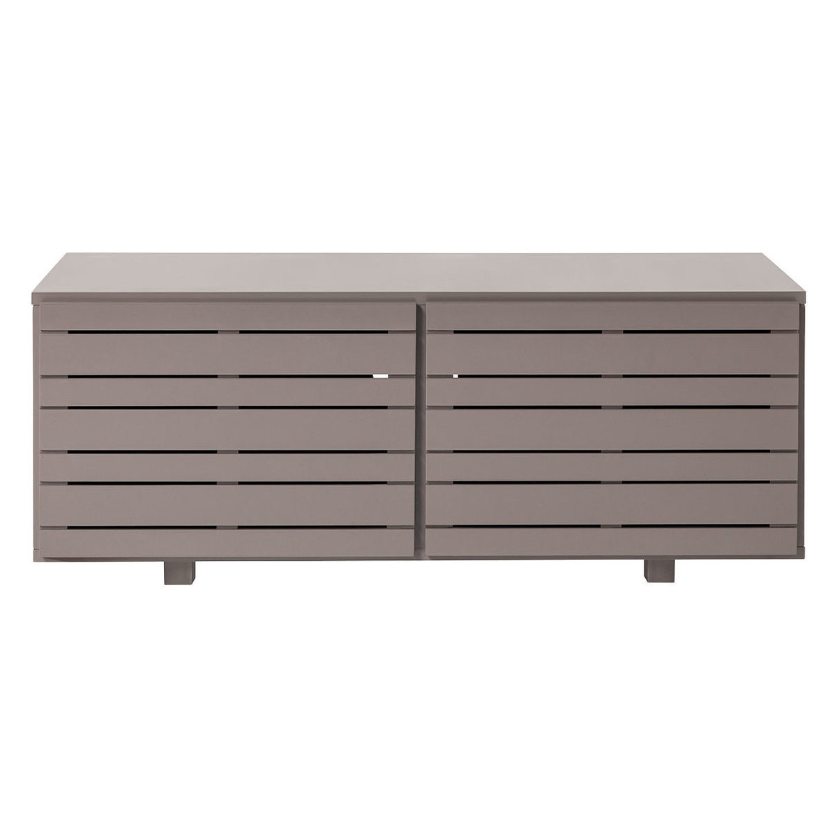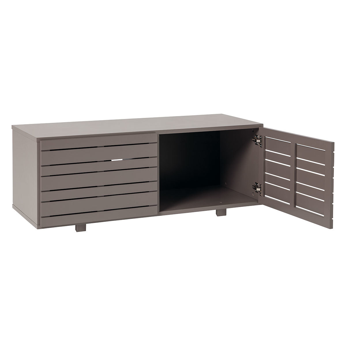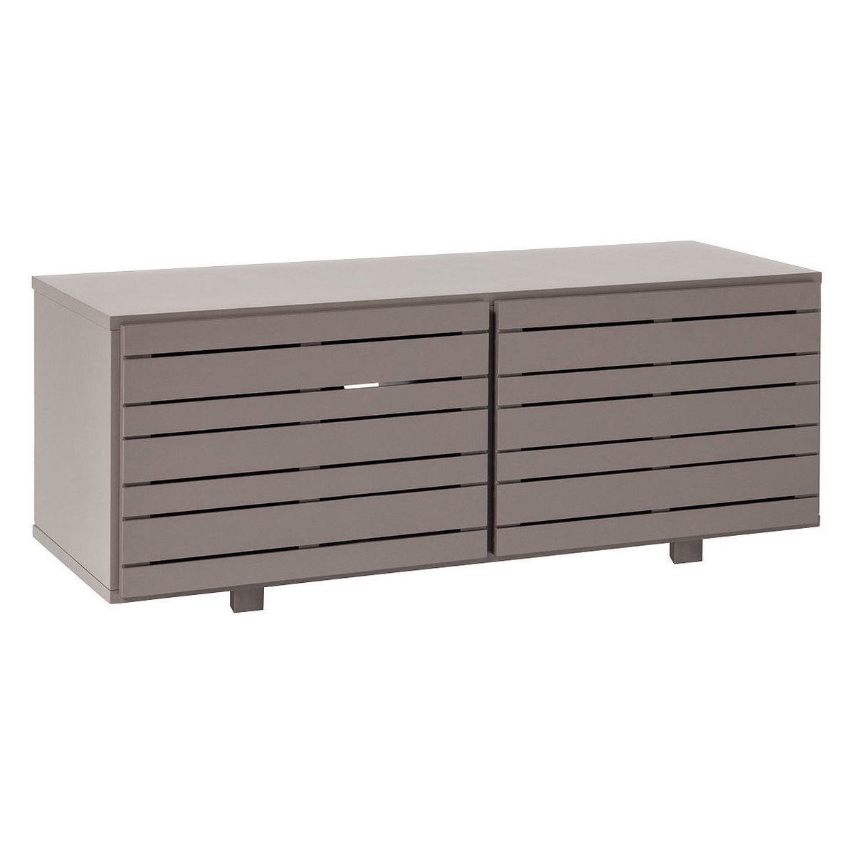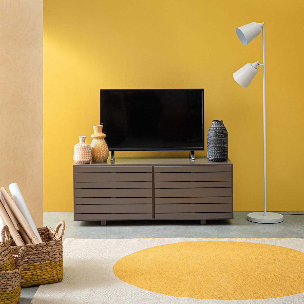Practical yet contemporary, the Fonda grey slatted lacquered wood TV stand is a stylish storage solution for the home. Made from lacquered wood for enhanced durability, the TV stand has a warm grey painted finish that brings a modern touch to your interior while its slatted detail adds to its statement design. Featuring 2 cupboards, inside each door is a roomy interior perfect for storing DVDs and accessories and cable management at the back of the open shelf hides away untidy wires from sight. Cleverly, when the doors are closed, your remote-control signal will still work through the design. A Habitat original design, Fonda has a compact footprint making it perfect for smaller spaces and suits all interiors. Part of the Fonda range, a corner TV stand and console cupboard is also available.