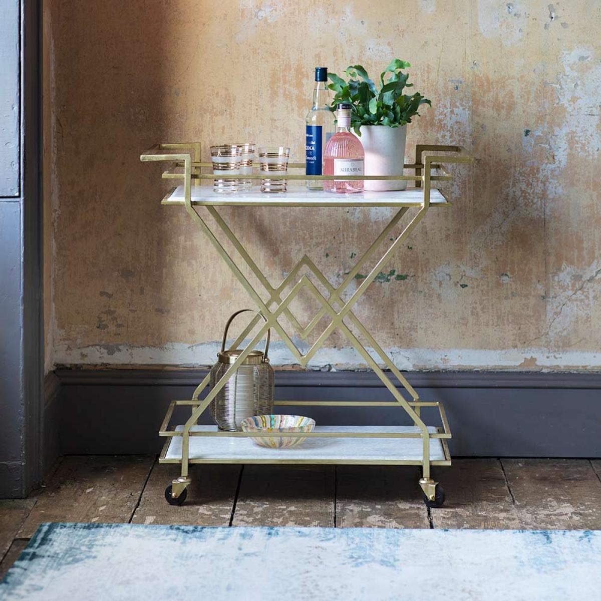 One of the latest trends in interiors and furniture is bar trolleys and drinks cabinets, as more and more of us enjoy entertaining at home. Our new Fontaine Marble Drinks Trolley is oh so glamorous with its Art Deco styling, white marble shelves and brass plated frame. It comes on wheels so is easy to move around when needed and offers plenty of space for drinks, glasses and cocktail shakers. Perfect for dining rooms and open-plan living spaces.