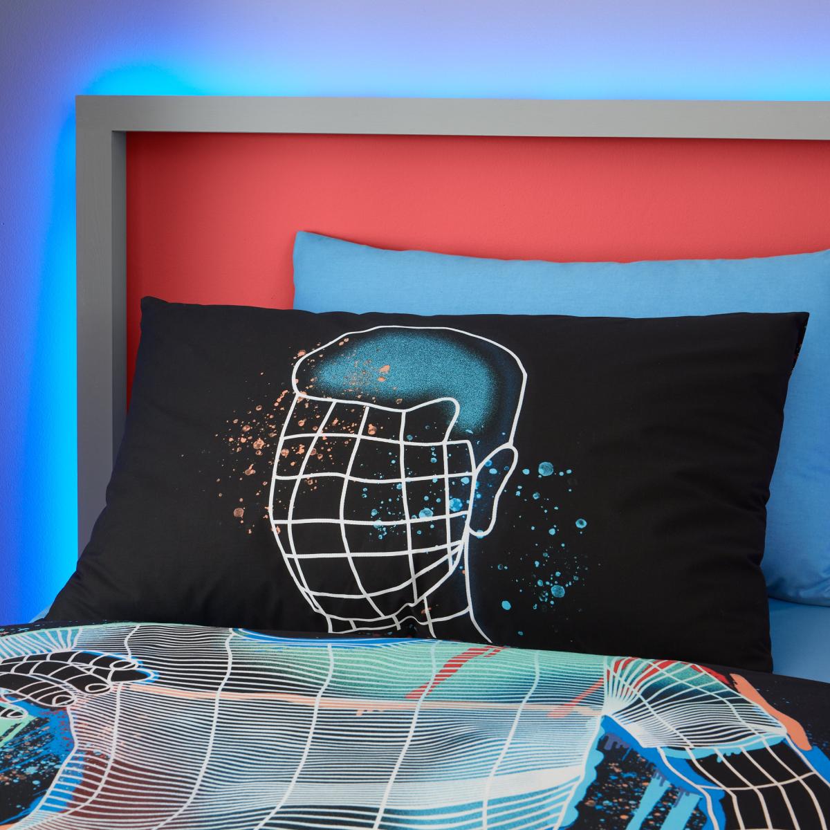 This football-themed duvet set is a great choice for a child's bedroom, especially for sports fans. Its bold black background with vibrant, graphic illustrations makes it a fun focal point that easily integrates into modern or sporty interiors. It works well with a streamlined colour palette-think primary colours, greys, or even pops of metallics for a contemporary look. For practical styling, pair it with neutral bed linens and add coordinating accessories like football-themed cushions or artwork to create a cohesive space. Its lively design also lends itself to minimalist bedding styles, allowing the pattern to be the centrepiece without overwhelming the room.