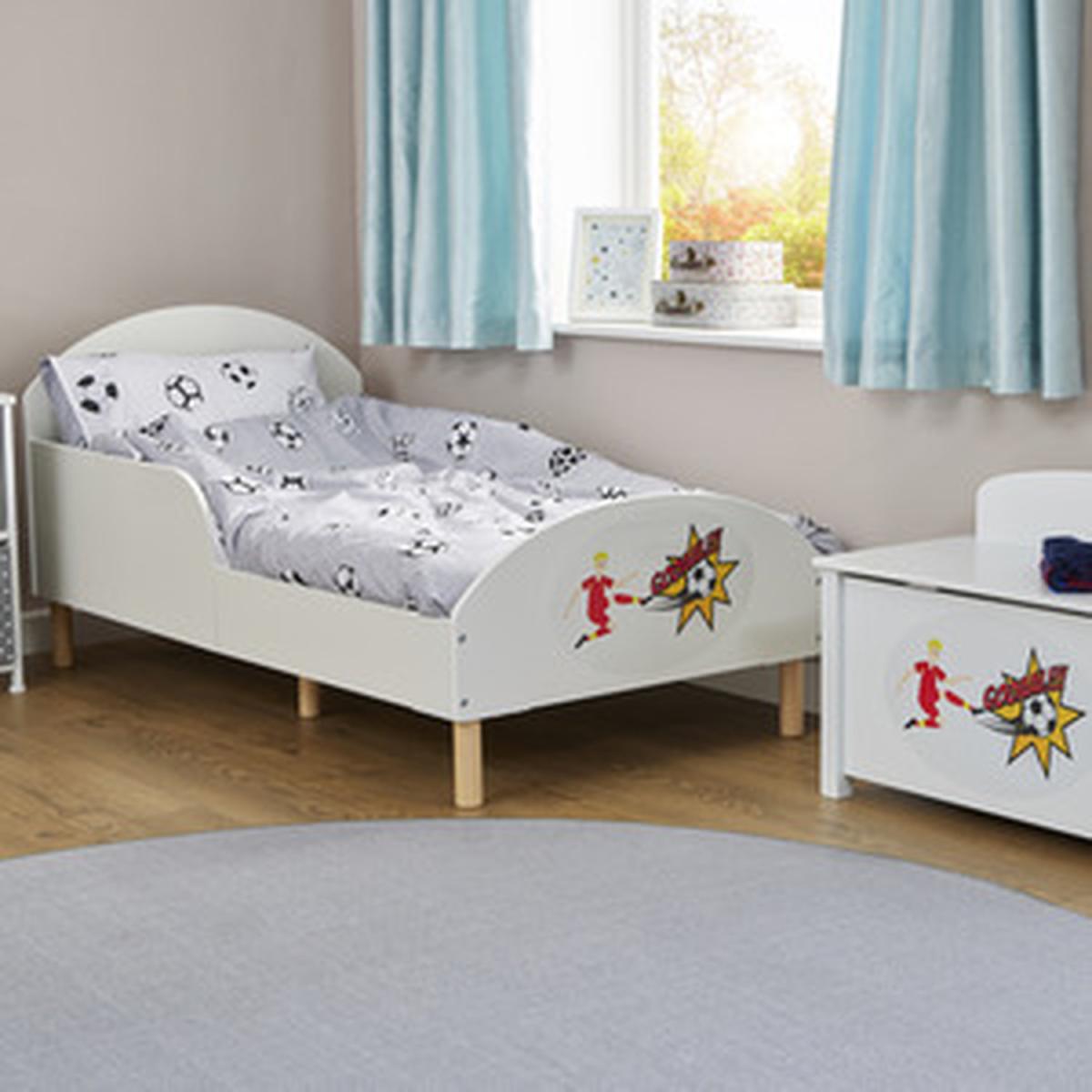 With an enclosed top frame and a modern rounded headboard your child will make an easier transition to their new bed as they are reminded of the snug confines of their cot, raised sides will stop your little one accidentally rolling or falling out of bed. Our Football toddler bed is low to the ground, making it easier for your young child to get in and out of bed safely. With a strong wood frame and round pinewood legs our Football toddler bed is well made, and the all white frame means this bed is easily accessorised with the bedding of your choice, the perfect canvas to create the bed of your little ones dreams. This Toddler Bed is supplied with a digitally printed Football decal and will fit perfectly into your Football themed bedroom
