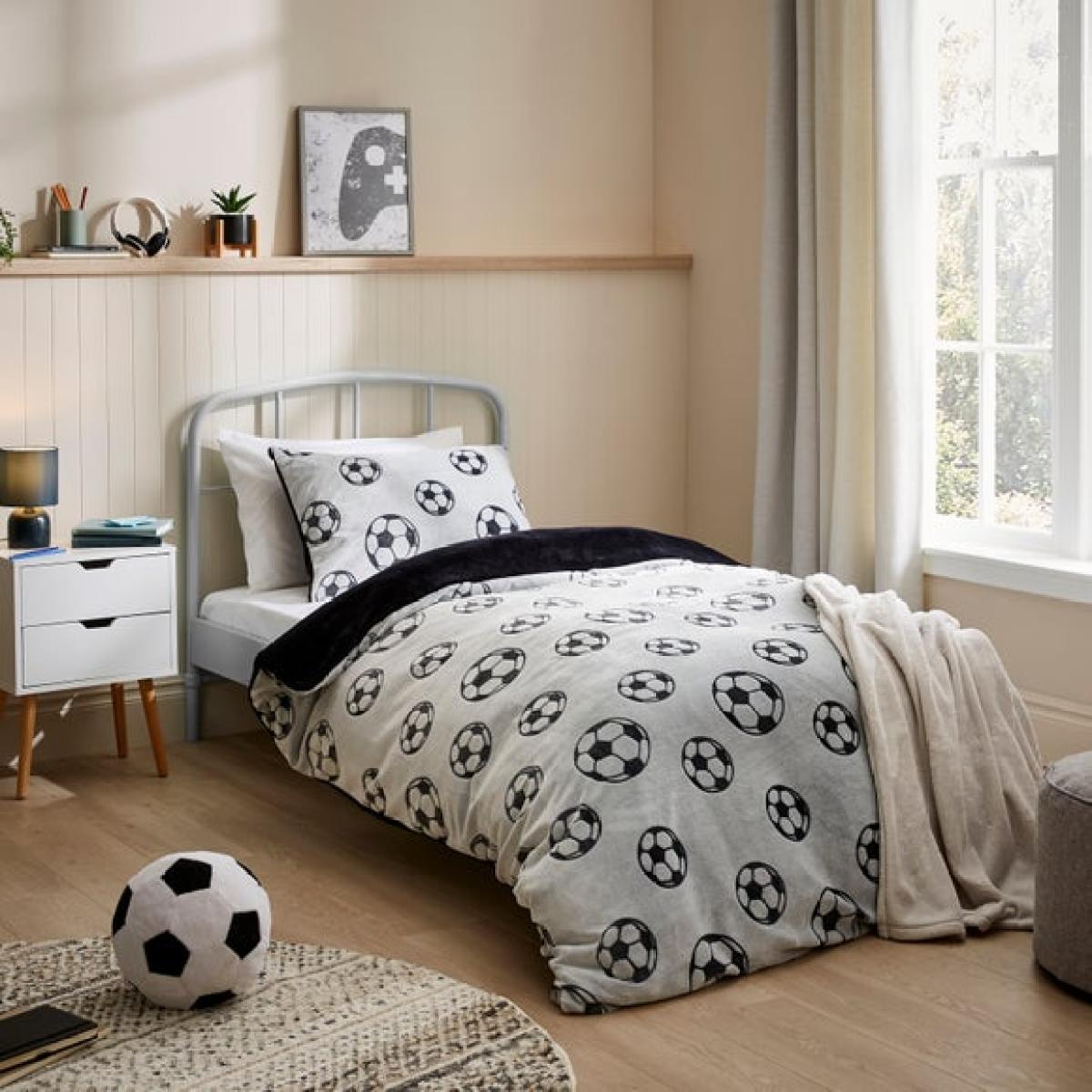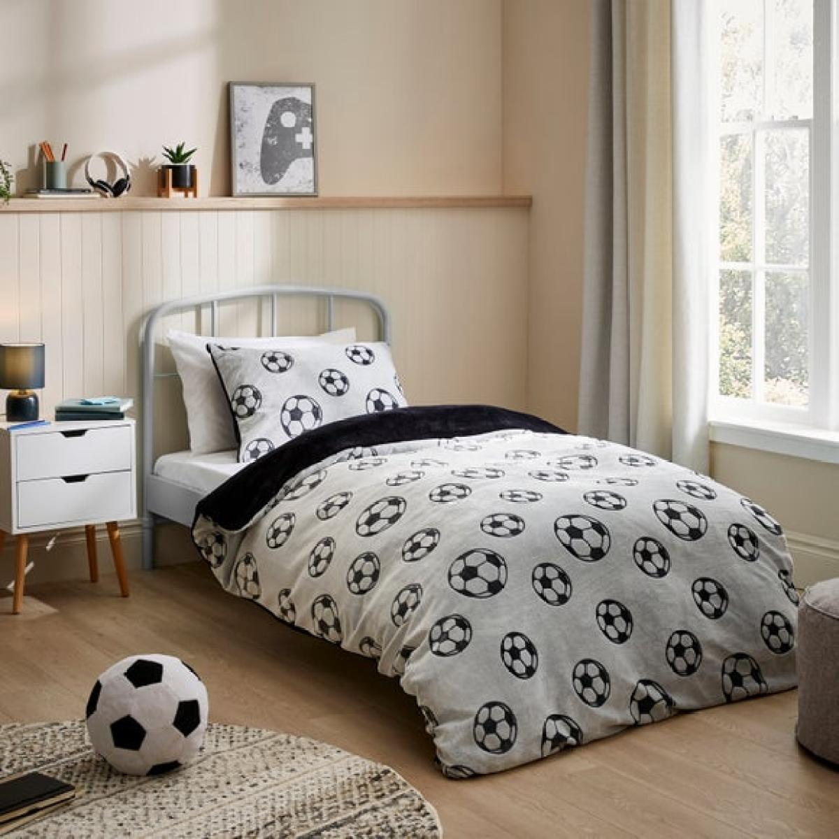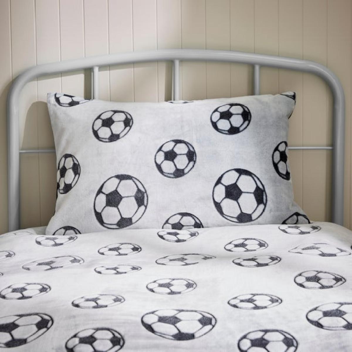 * Football fleece design * Made from 100% recycled polyester * Available in multiple sizes * Warm & cosy Score style points with the Football Marl Fleece duvet set perfect for sports fans of all ages. Made from 100% recycled polyester, this set is soft, warm, and full of character. With its sporty design and cosy fleece texture, it’s a winning choice for gifting or updating a football themed room.