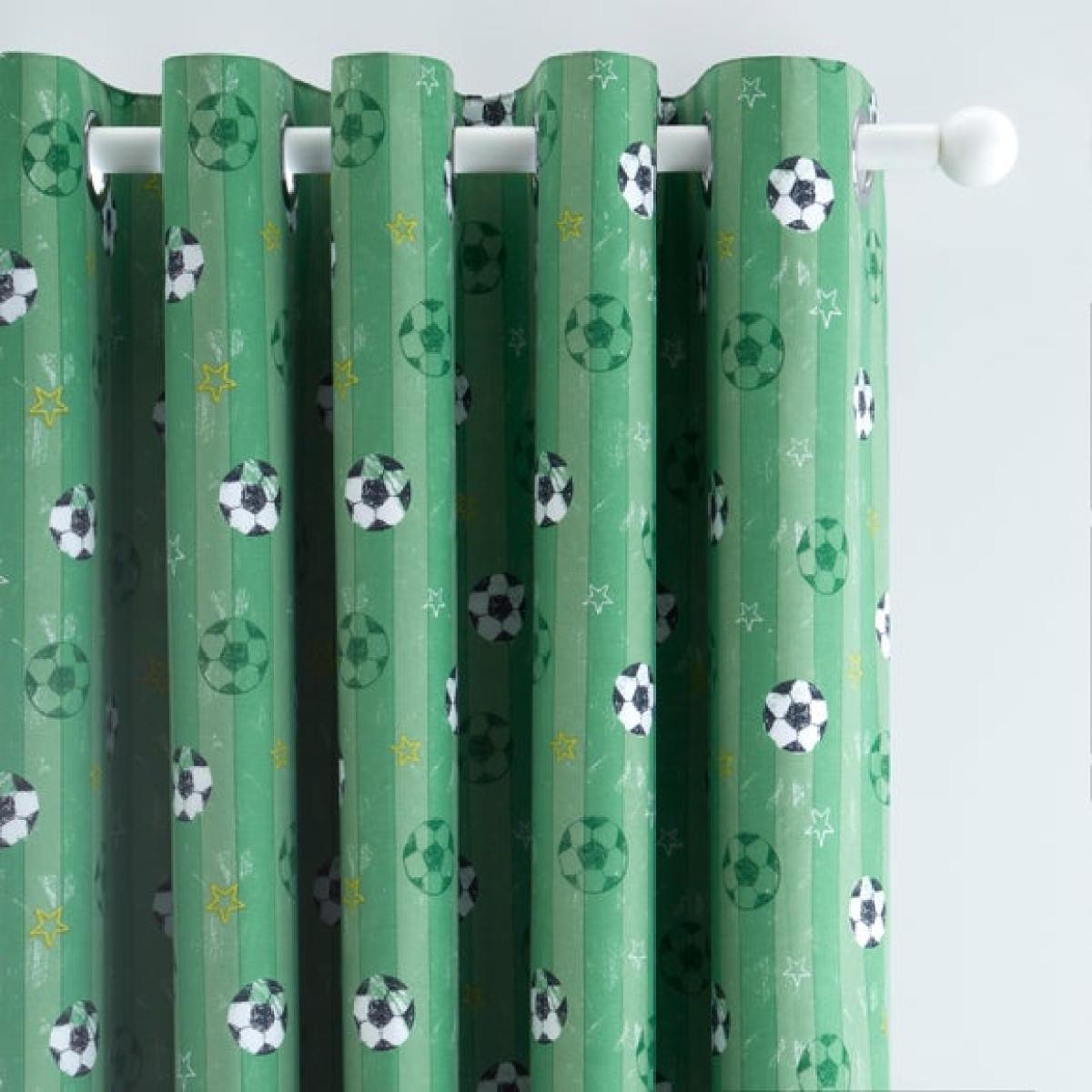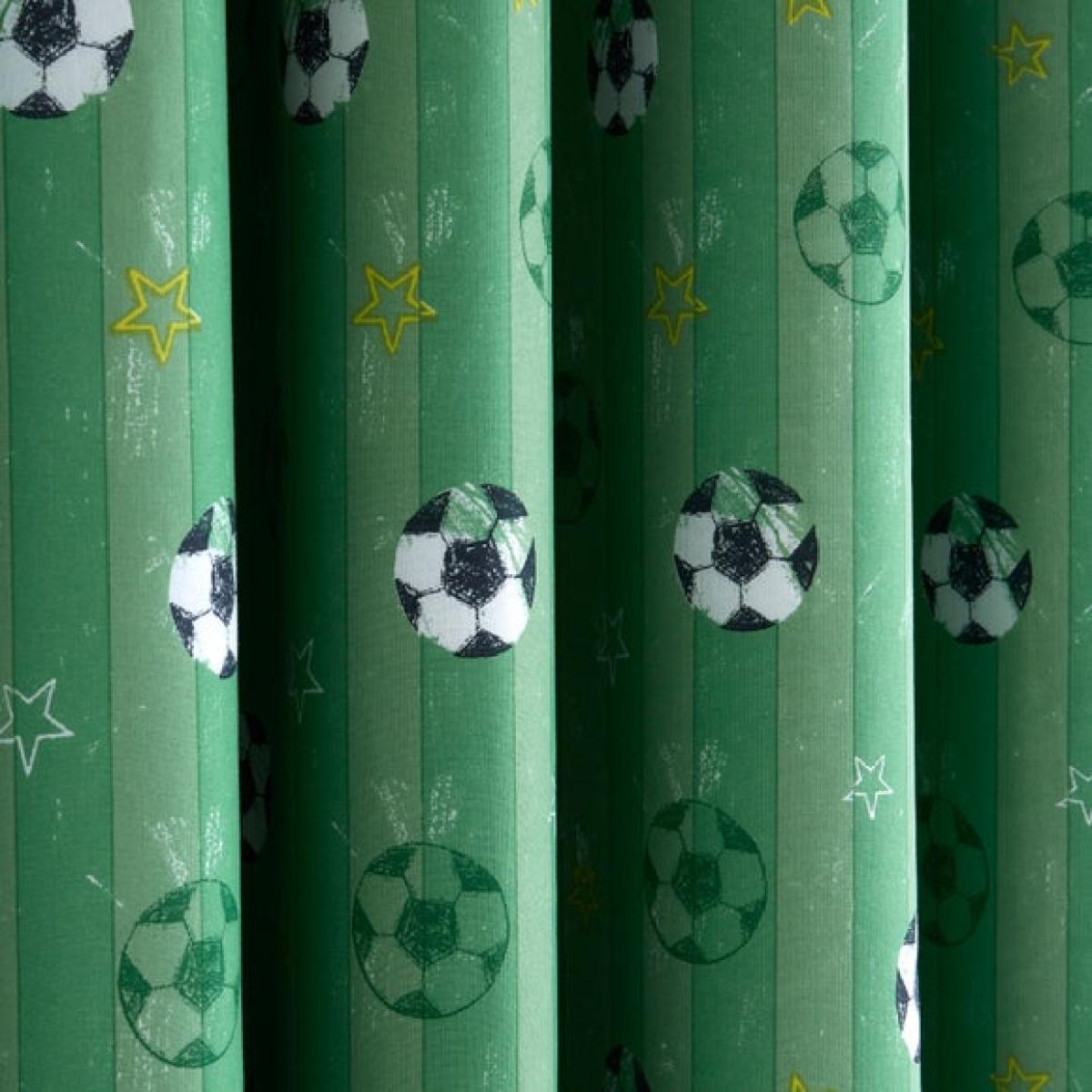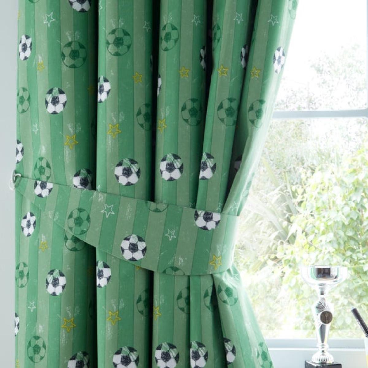 * Blackout lined * Included tiebacks * Fun football design Score big on style and sleep with these Football Pitch Blackout Eyelet Curtains. Featuring a bold football pitch design, they’re perfect for little ones who dream of scoring the winning goal. The blackout lining helps block out light, making them ideal for restful nights and weekend lie-ins. Easy to hang with a fuss-free eyelet header and machine washable for everyday ease. Matching tiebacks are included to keep things tidy during the day. A great choice for any young football fan’s bedroom.