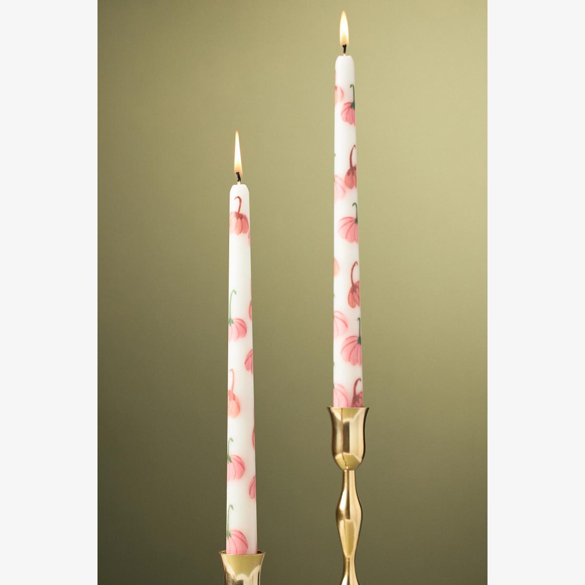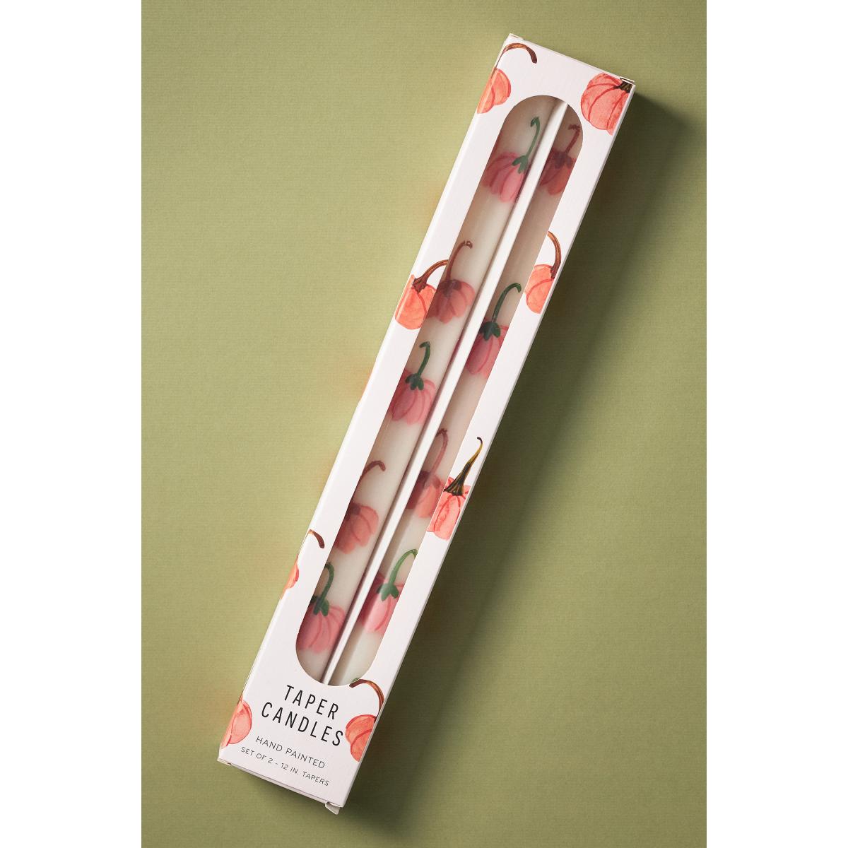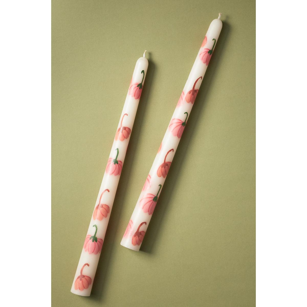 Painted with fall icons, these 30cm taper candles are made from unscented paraffin wax. *For the best burn experience, keep the following in mind:* * The first time you light your candle, allow it to burn until the wax pool melts all the way to the edge; for a larger candle, this may take several hours. Wax has "memory," so if it is extinguished with a partial pool, that will prevent a full, even pool from forming in the future. * Trim your wick each time you light the candle, removing any "bloom" from the previous burn. We recommend lighting a wick that is 1/4-1/2" in length. * Ensure that your candle is placed on a heat-safe surface. * Do not allow wick trimmings, dust, or other materials to accumulate in the wax pool. * To ensure safety and longevity, be sure to check the bottom of your candle for additional instructions, including details on when to discontinue use. * Set of two taper candles * 10-hour burn time each * Hand-poured paraffin wax blend; fil-tec candle wick * Imported