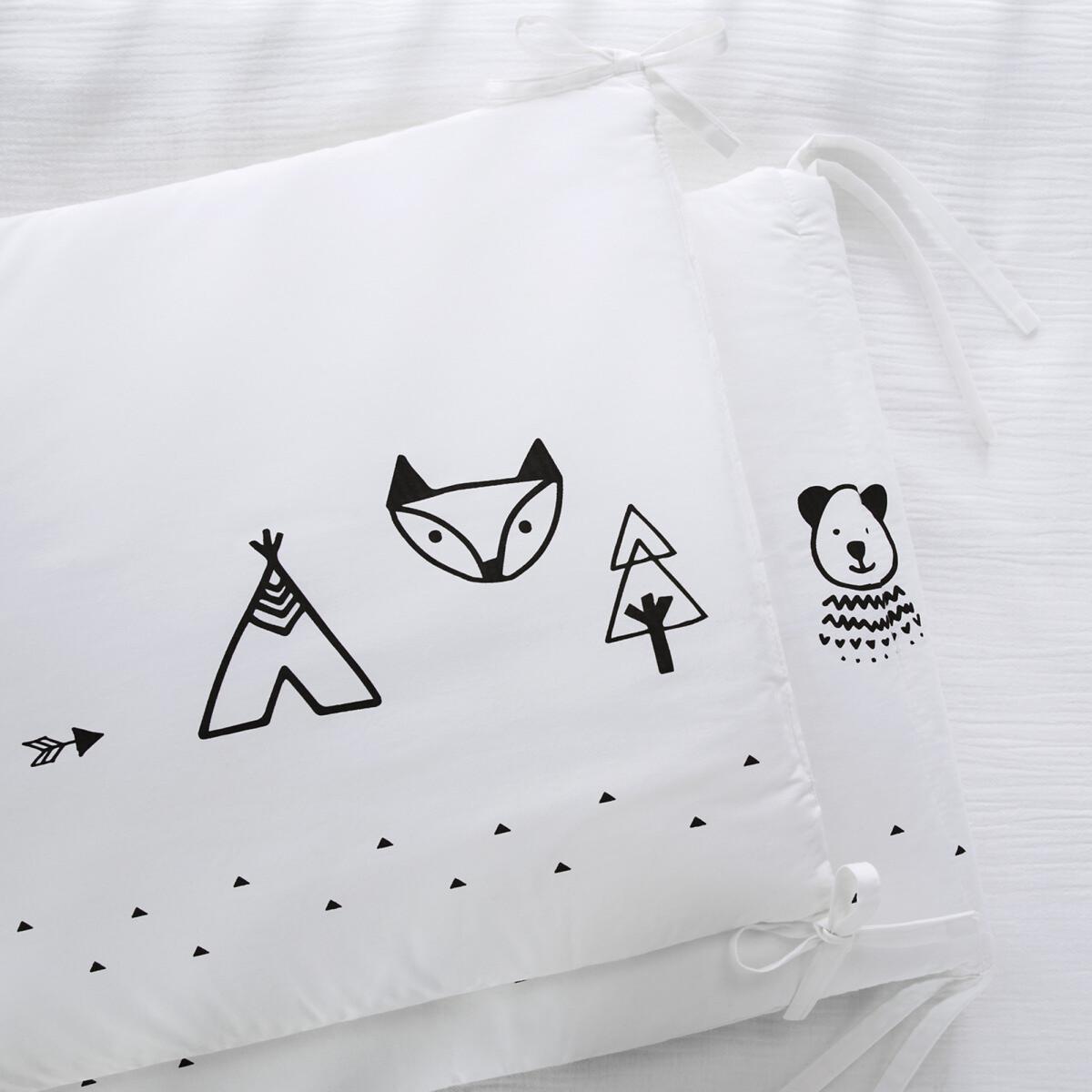 This Forest Camp cot bumper in organic cotton percale features a print of small black designs on a white background.