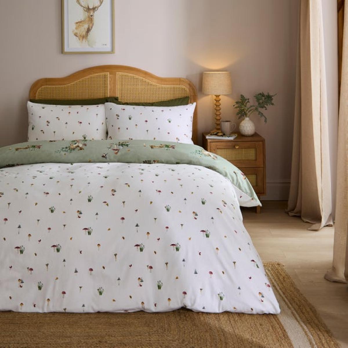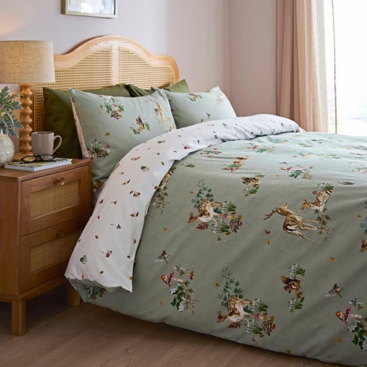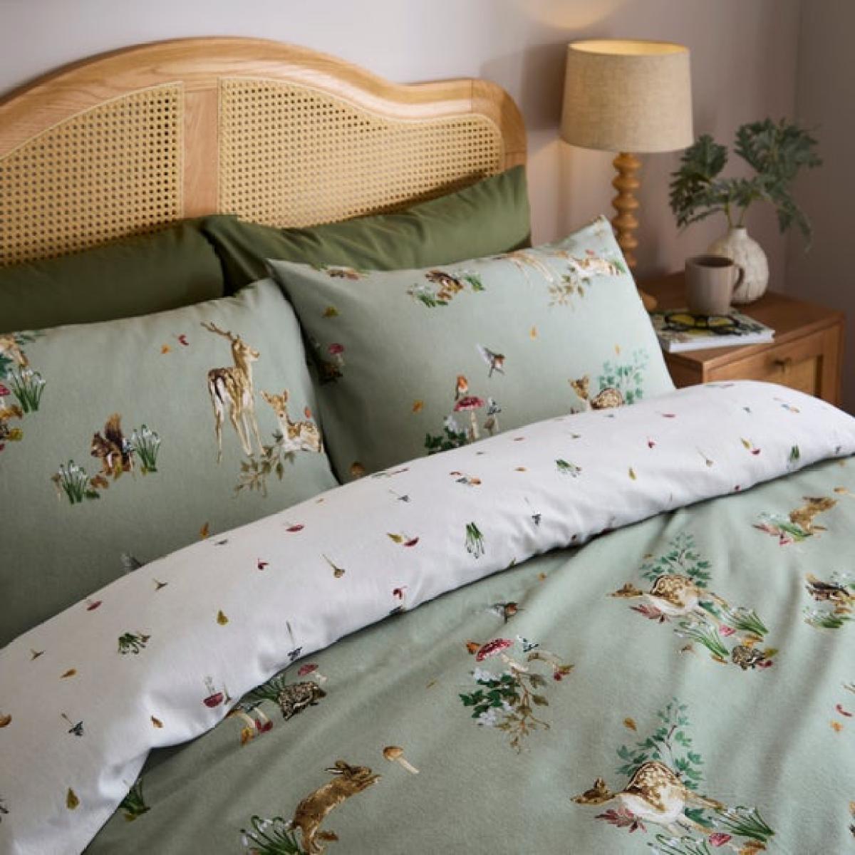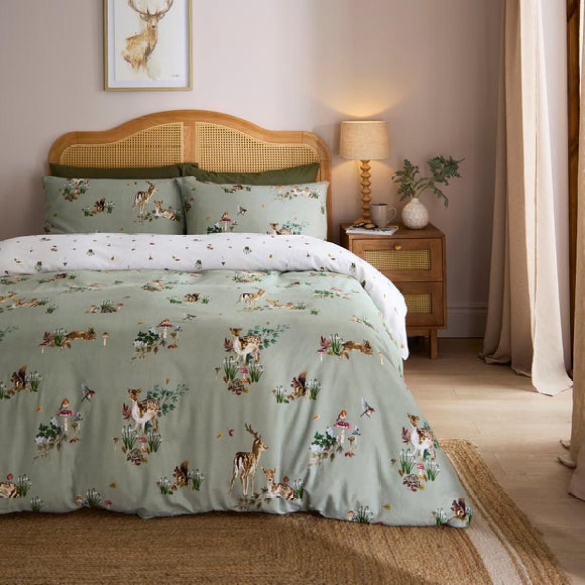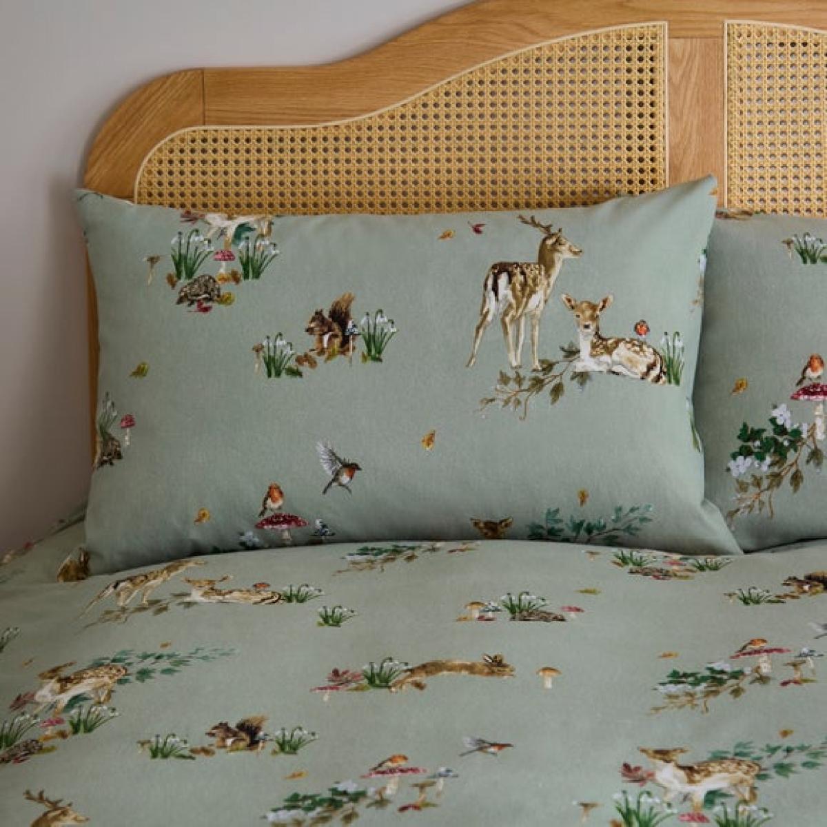 * Soft and cosy, brushed cotton composition * Elegant, forest design * Button closure * Corresponding items available * Machine Washable Add a touch of woodland wonder to your bedroom with the Forest Fawn Brushed Cotton Duvet Cover & Pillowcase Set. Featuring elegant forest-inspired artwork and crafted from 100% brushed cotton, this cosy bedding set brings warmth and charm to your space. The soft brushed finish is perfect for colder months, offering a gentle, comforting feel against the skin. With its natural tones and graceful design, Forest Fawn suits a range of interiors - from rustic to modern. It’s finished with a secure button closure and can be paired with coordinating pieces for a snug, layered look. Easy to care for and irresistibly soft, this set turns your bedroom into a peaceful, woodland retreat. This collection is verified by OEKO-TEX® and independently tested for harmful substances as well as manufactured using sustainable processes under socially responsible working conditions. MADE IN GREEN by OEKO-TEX® is a unique product label to trace the countries and production facilities - search the product label for more information.
