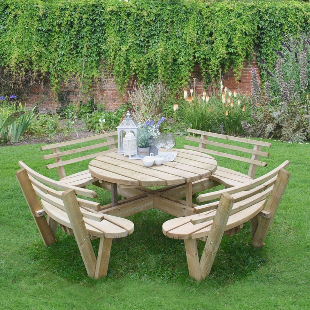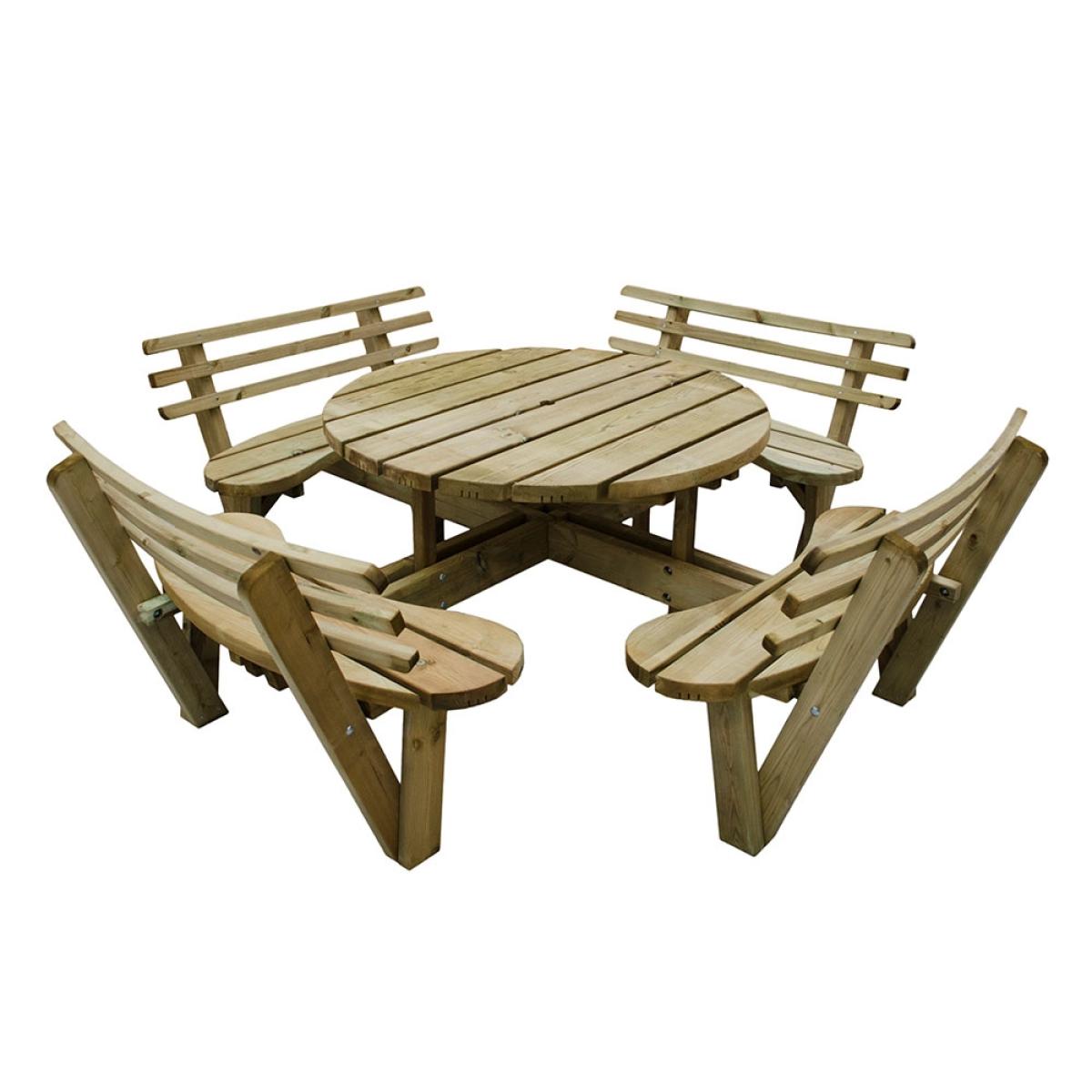 Seating 8 people comfortably; enjoy al fresco wining and dining with the. Forest Garden Circular Picnic Table with Seat Backs. Featuring an attractive rounded design with curved seat backs, sit down to family BBQ's and continue relaxing long into the evening. With space for a parasol, add a little shade to your wooden dining furniture set. Crafted from high quality, responsibly sourced timber, the table and benches have been pressure treated to protect against rot and decay ensuring you can use them year after year without worry. Paint your set to add a pop of colour to the garden or leave the gorgeous wood exposed for a more natural finish. With other wooden furniture, planters and structures available from Forest Garden, get your outside space ready for the summer!.