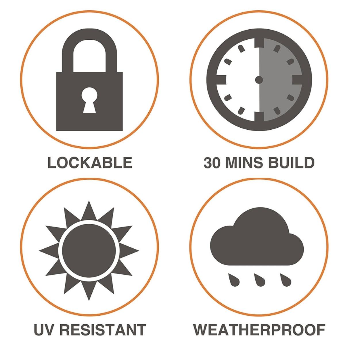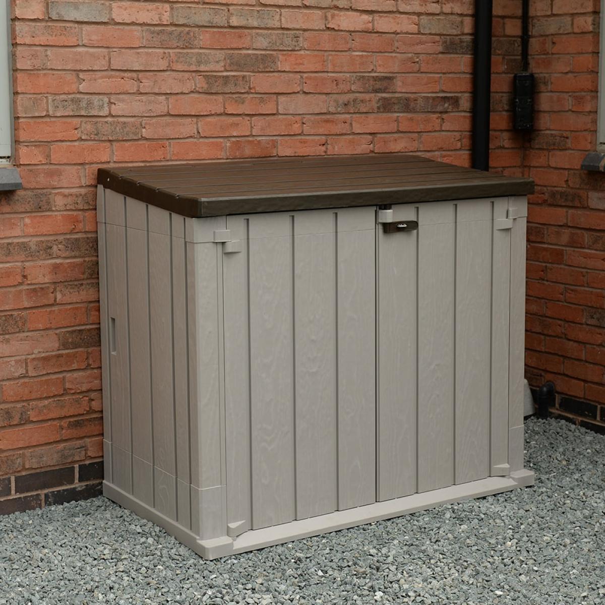 Versatile and practical, the. Forest Garden Plastic Garden Storage Unit ticks all the boxes. Available in 2 sizes, there's plenty of room for barbecues, gardening tools, lawnmowers, smaller furniture and kids outdoor toys. In need of a bike store? The extra large 1200. L store would be perfect!. Not just for tidying away; the units can house 2 wheelie bins! With a fully opening front and lid, rolling your bins in and out is pain-free! Quick and easy to construct, each of the components have been designed to snap and slot together - assembling garden storage has never been so simple. Made from durable and UV resistant polypropylene, the turn handle and lockable design ensures your chosen contents are well protected. With other garden storage available here at Cuckooland, your outside space will be the epitome of tidy!.