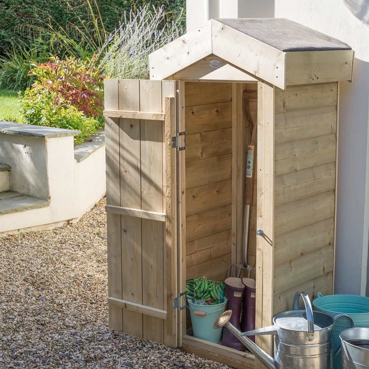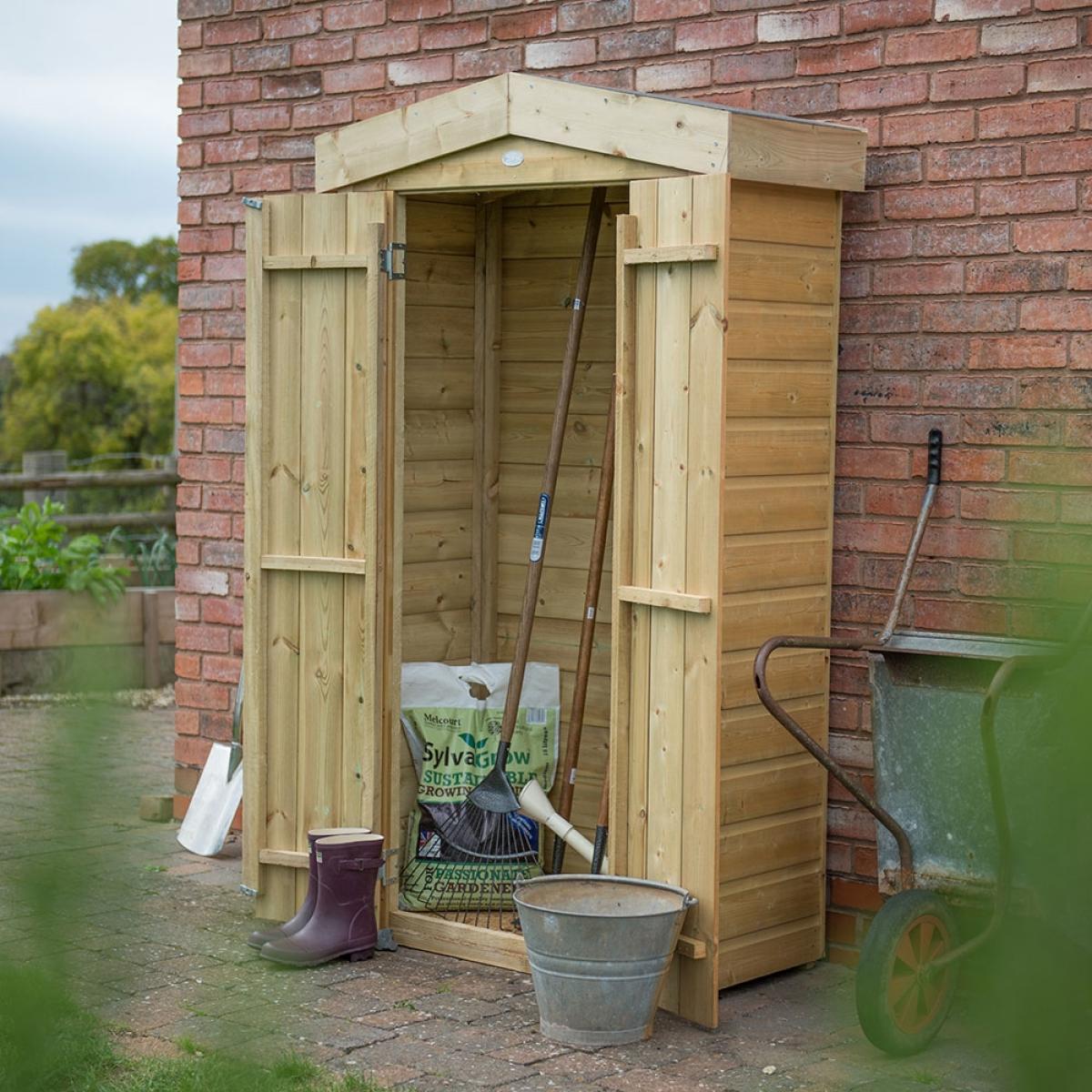 Who says garden storage can't be easy on the eye? Keep your collection of garden tools and equipment safe inside the contemporary Forest Garden Shiplap Apex Garden Store. Suited to storing brooms, spades and strimmers; there's plenty of space for your gardening essentials. Why not pop everyone's wellies in the base and keep your storage box by the back door! Designed with a smaller footprint, it would be perfect for modest gardens and patios. Your store is kept secure with the hidden hinges and the lockable plate hasp and staple fastening. Mounted on bearers and with a high quality apex mineral felt roof, your chosen contents are protected from the elements too! The robust interlocking shiplap tongue and groove boards have been pressure treated to prevent rot, and with a 15 year guarantee, you know it's been built to last! Available in 3 sizes or with a pent roof, select the store to suit your space!.
