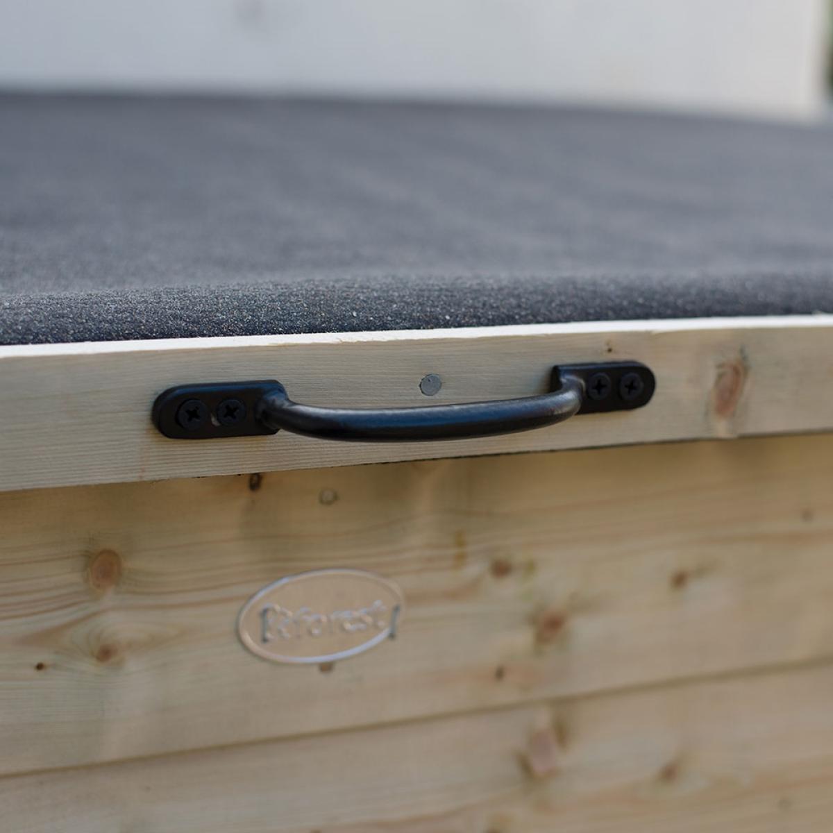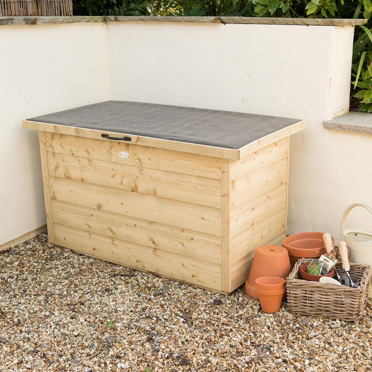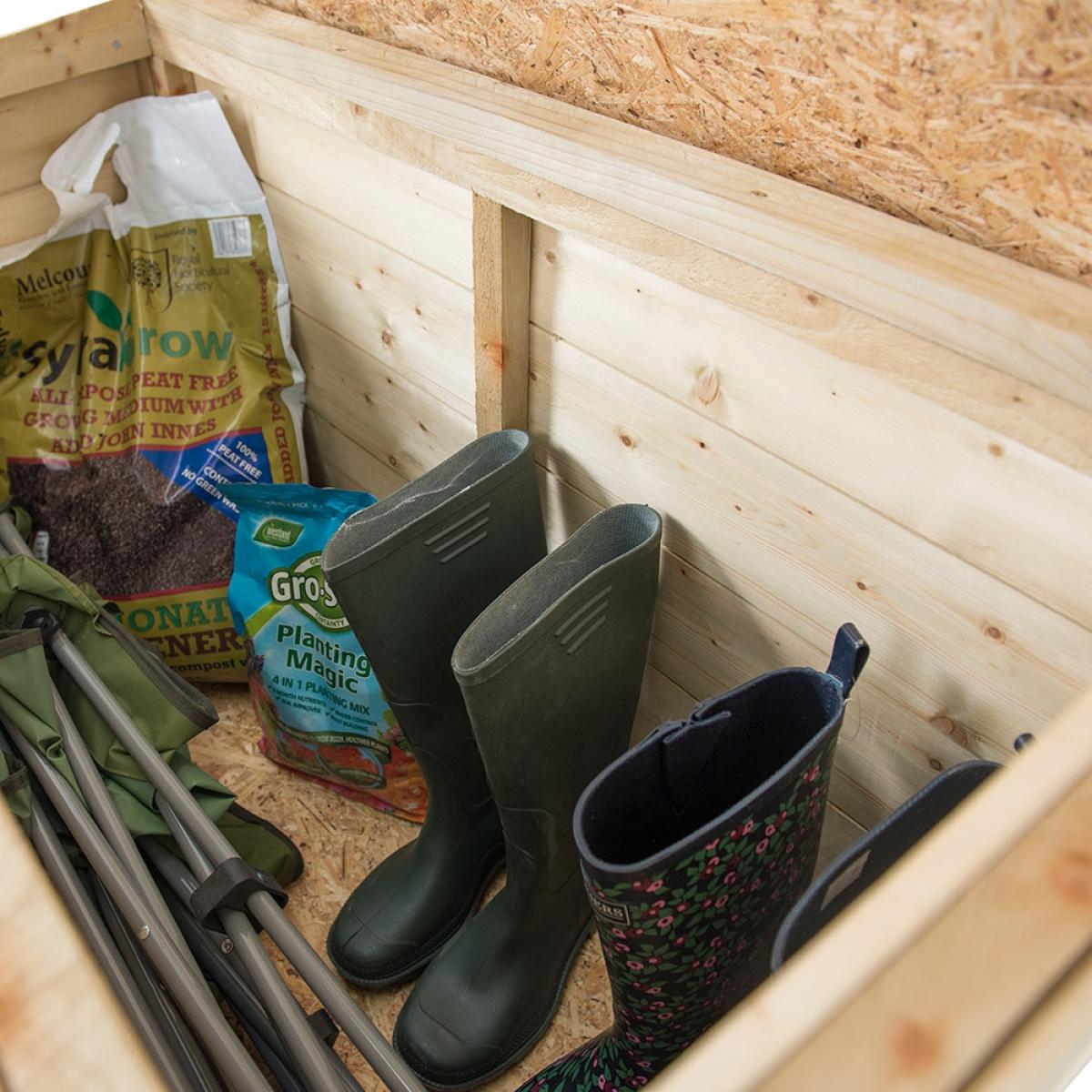 In need of some outdoor storage? Tidy away muddy boots, garden tools or kids toys inside the Forest Garden Shiplap Storage Box. Perfect out on the patio, by the back door or even in the garage; the storage box has a small footprint making it an inoffensive addition. With 300. L capacity, there's still plenty of space for your outdoor essentials! Featuring a lightweight lift-up lid with handle, you could even use it as a parcel drop box? Mounted onto pressure treated bearers, your chosen contents will be kept dry and protected. Built to last and made from high quality timber, the interlocking shiplap tongue and groove boards have been pressure treated to protect against rot with a 15 year guarantee. Available in other finishes, select the garden store to suit your needs!.