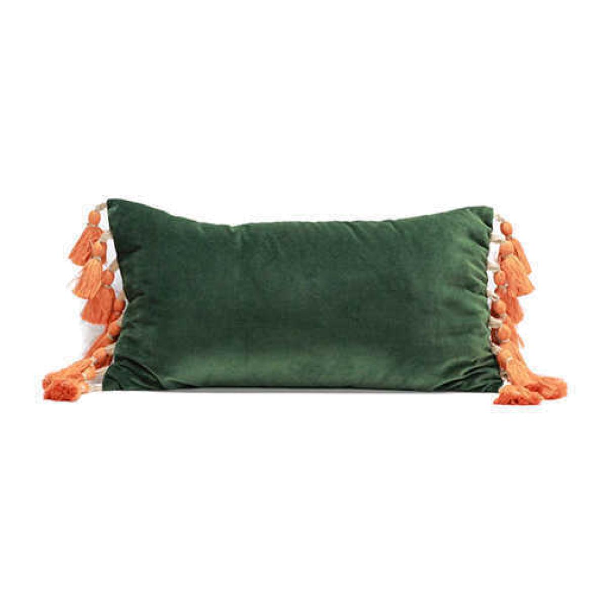A high-style and statement-making decorative pillow that's handcrafted in luscious cotton velvet and Smith. Hönig's Verymore fringe trim. Filled with a luxurious down alternative with a great hand. 100% cruelty-free! This 14″ x 20″ pillow pairs perfectly with patterned or matching solid velvets. Ready to go more maximalist? Edge your drapes or a skirted table with the coordinating trim. Spot Clean
