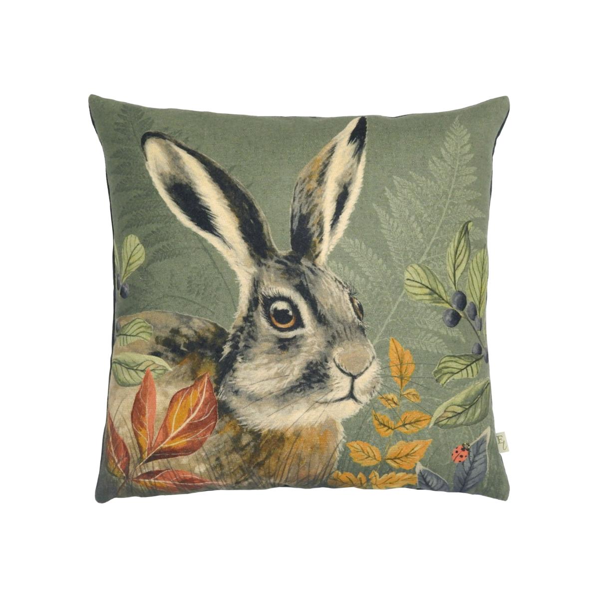 Bring a little wildlife to your interior with this super sweet hand painted Hare design. The appealing nature of the Hare on a neutral coloured background with autumnal leaves and a contrasting velvet reverse makes this cushion the perfect touch to any home.