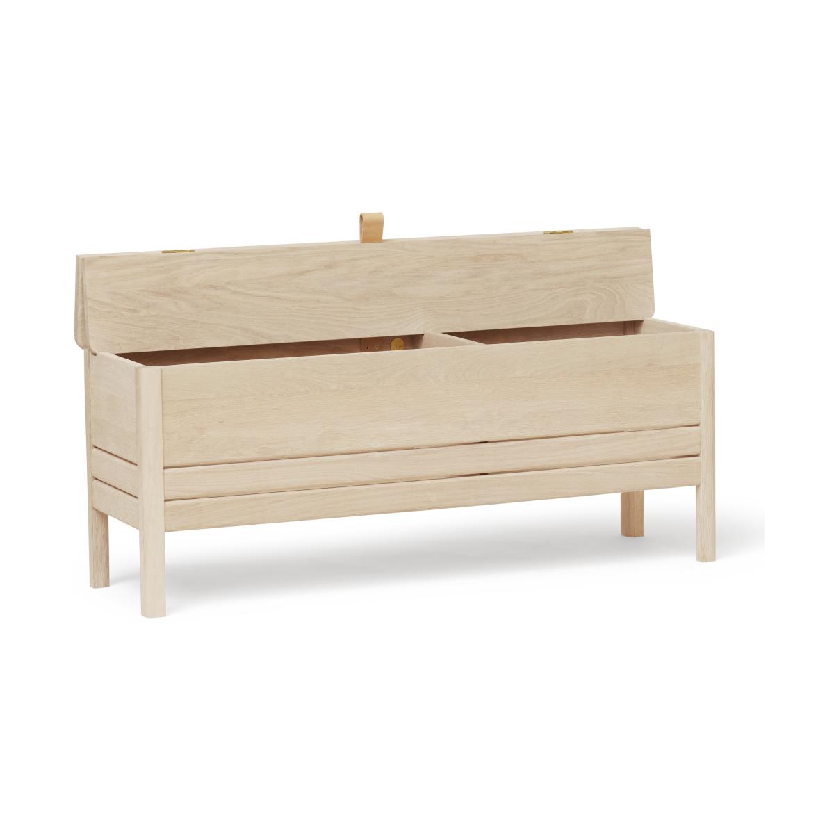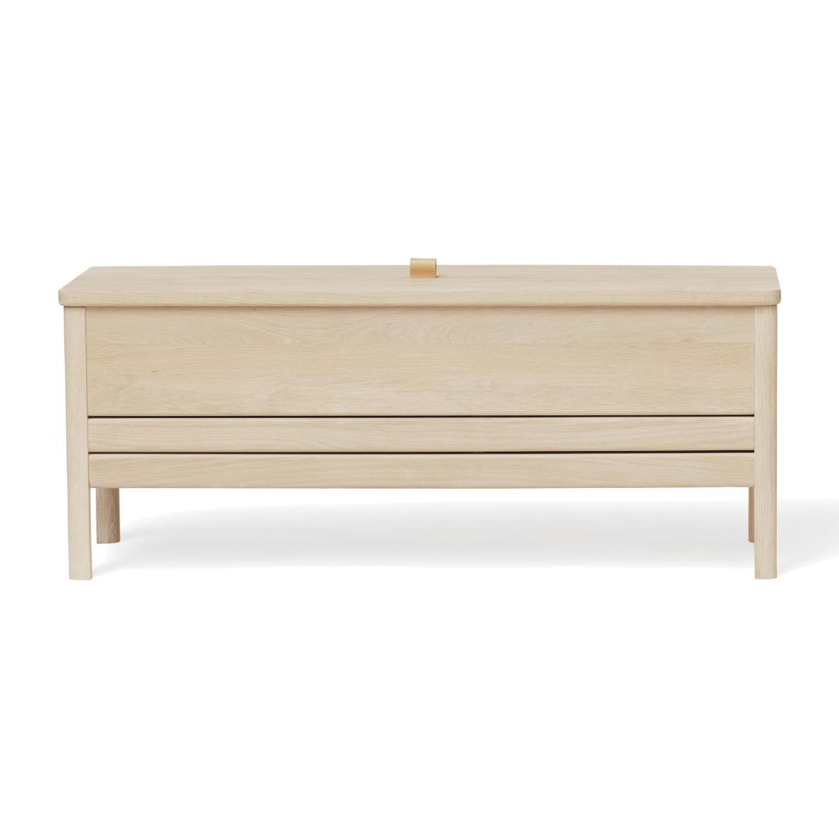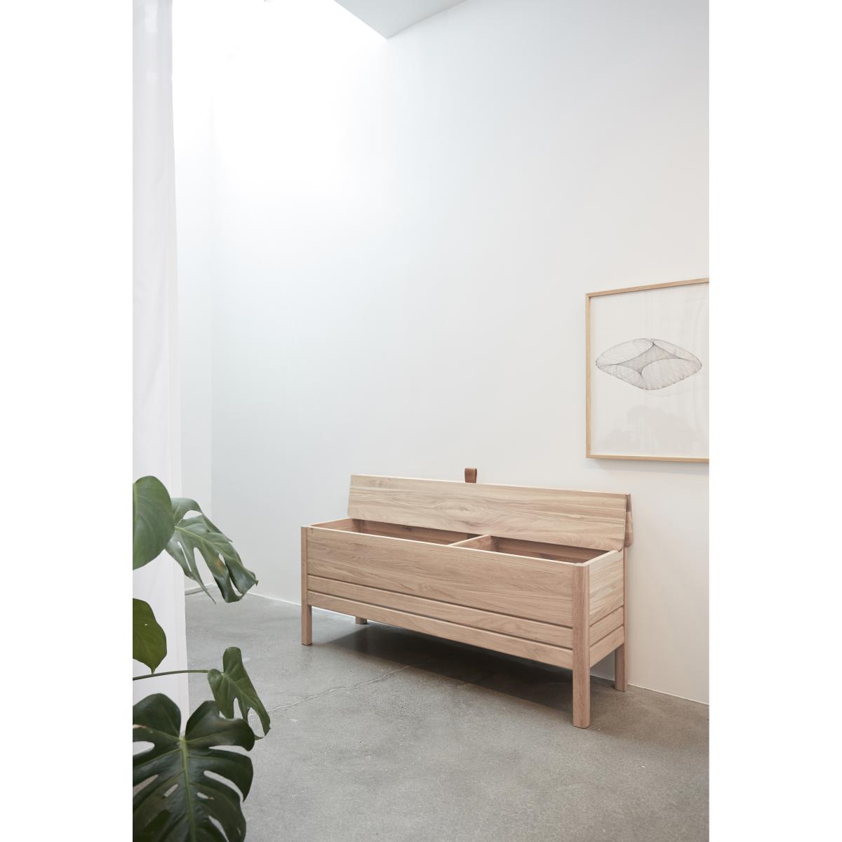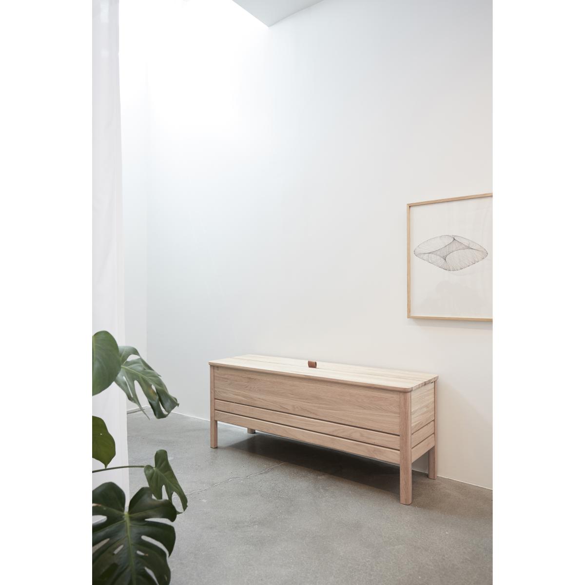 I love this bench for its clean, streamlined silhouette and natural oak finish, which makes it versatile across various interior styles. It works beautifully in minimalist or Scandinavian-inspired spaces, serving as both functional storage and seating. Practical styling tips include placing it at the foot of a bed, under a window, or in an entryway, where it can double as a convenient spot for shoes or bags. Its neutral tone allows it to be paired with colourful cushions or throws for added texture, or left as a sculptural statement in a neutral palette. The built-in storage is a clever feature, keeping clutter out of sight while maintaining a sleek look.
