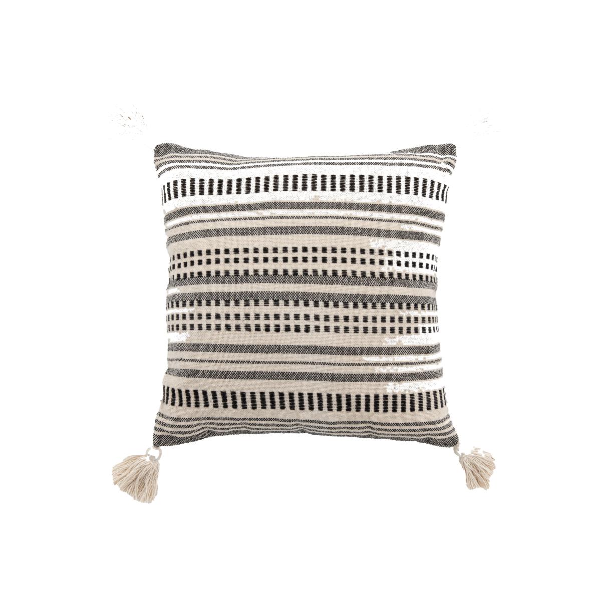 I love this cushion cover for its versatile monochrome palette and textural appeal, making it an easy addition to various interior styles. It works particularly well in modern, minimalist, or Scandi-inspired schemes, where its black and natural tones add depth without overpowering. For styling tips, try pairing it with neutral-toned sofas or beds to create a relaxed, yet polished look, or layer it with other patterned cushions for more visual interest. Its tassel details also lend a touch of visual intrigue, perfect for adding subtle texture and personality to a laid-back living space or bedroom.