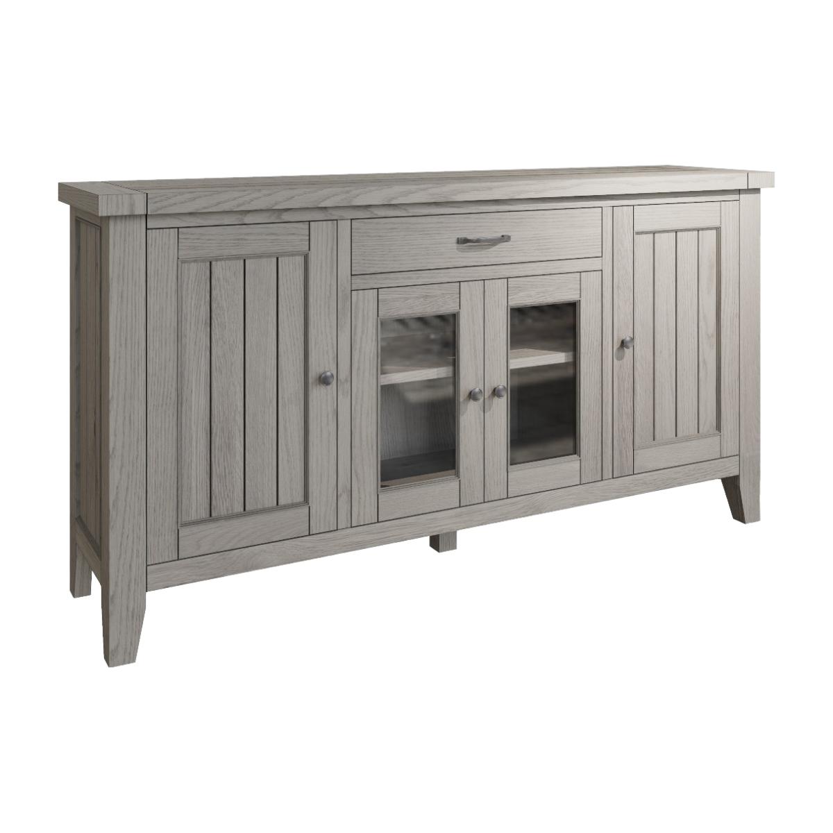 Treat your home to the bold shapes of the Forrest collection. These stylish pieces are made from a unique mix of durable materials with chunky legs, a solid frame and stunning panelled doors - designed to last you a lifetime. Show your favourite pieces in the glass-fronted cupboards and store other items behind the beautifully panelled doors. There is also a useful drawer for knives and forks. Constructed with oak, oak veneers, ply, MDF and love. An eye-catching grey oak finish. Cupboard doors with pewter-effect knobs. Dovetailed drawer with bar handles