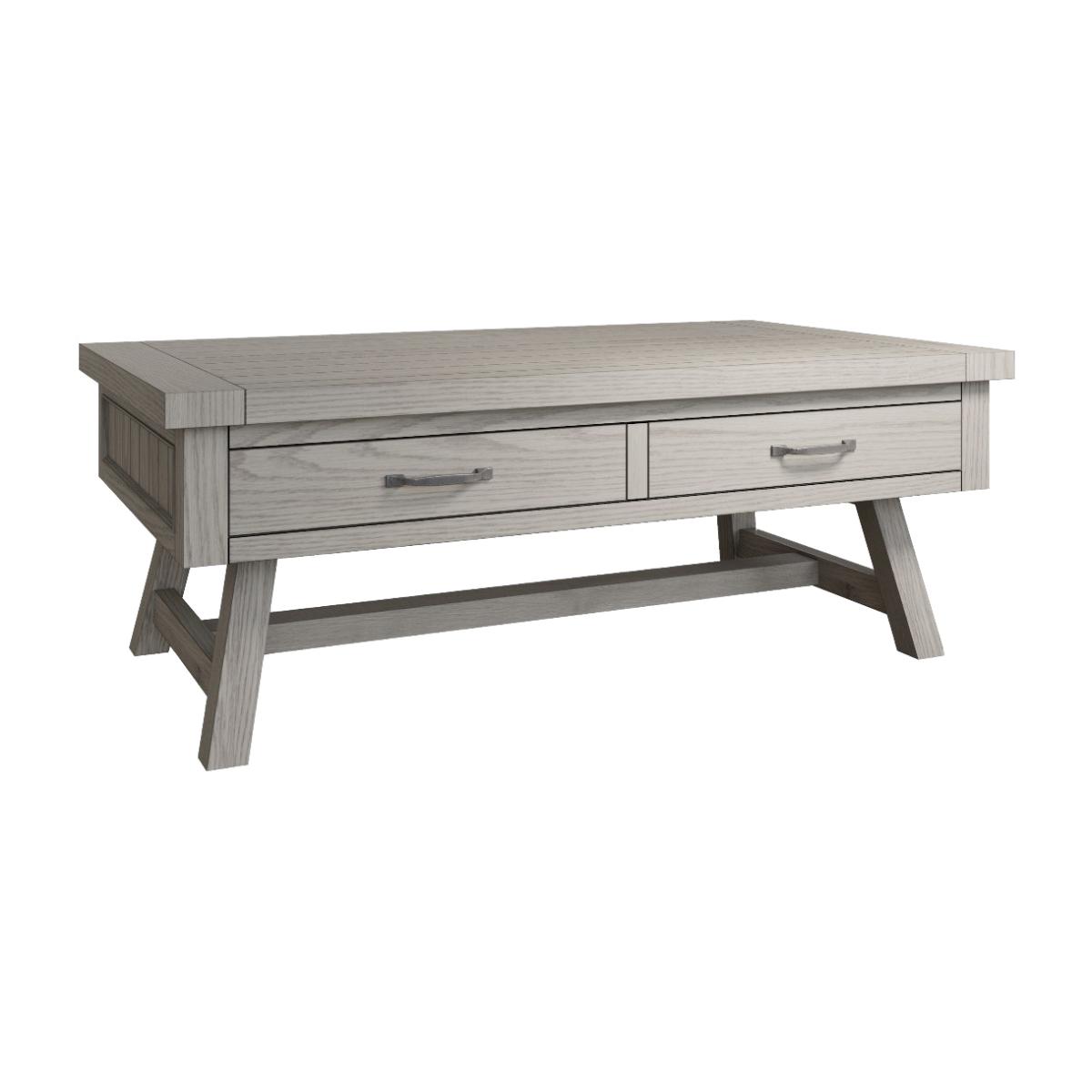 Treat your home to the bold shapes of the Forrest collection. These stylish pieces are made from a unique mix of durable materials with chunky legs, a solid frame and handy drawers- designed to last you a lifetime. Guests love this statement coffee table that ensures you are never short of conversation. Constructed with oak, oak veneers, ply, MDF and love. An eye-catching grey oak finish. Two dovetailed drawers with pewter-effect bar handles. Rectangular legs splayed at a quirky angle